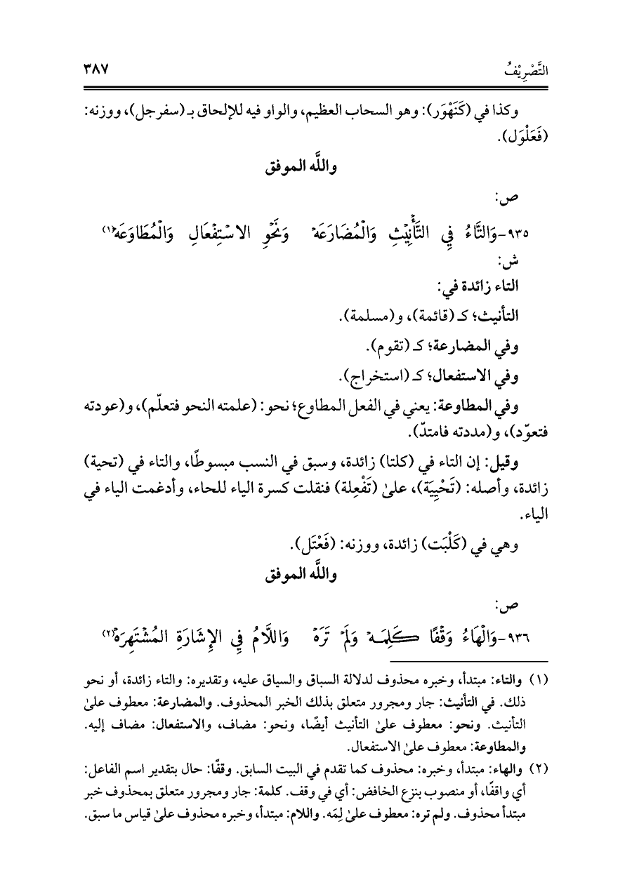 ٩٣٥ - وَالتَّاءُ فِي التَّأْنِيْثِ وَالْمُضَارَعَهُ ... وَنَحْوِ الاسْتِفْعَالِ وَالْمُطَاوَعَهْ (¬١)