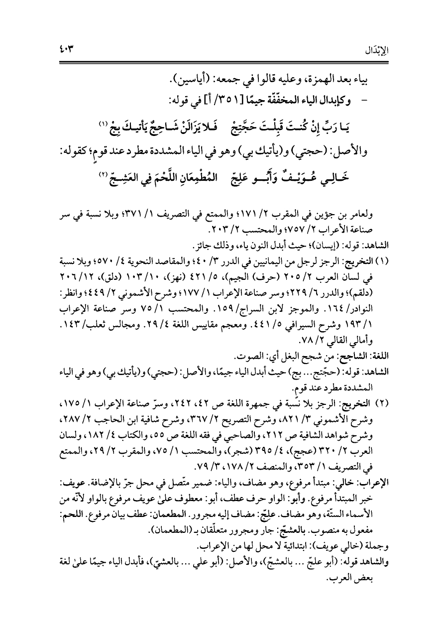 الشاهد: قوله: (حجّتج ... بج) حيث أبدل الياء جيمًا، والأصل: (حجتي) و (يأتيك بي) وهو في الياء المشددة مطرد عند قومٍ.