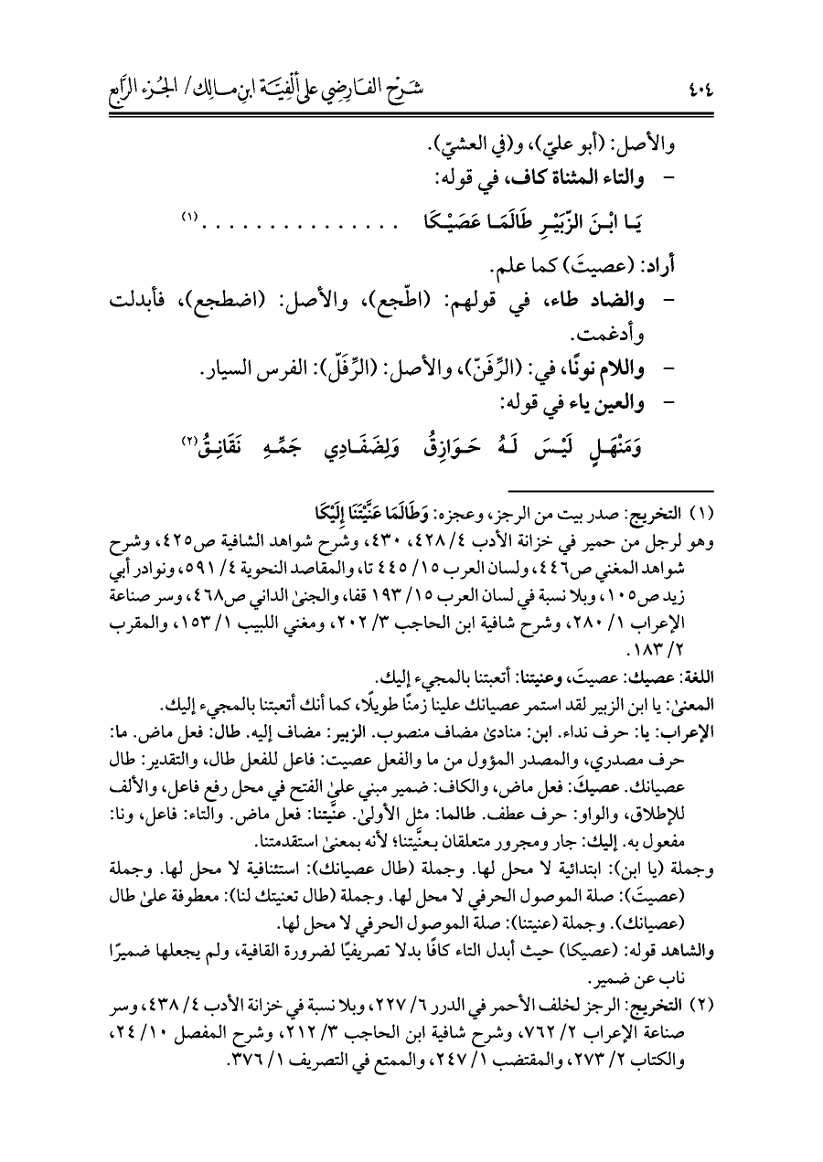 الإعراب: يا: حرف نداء. أبن: منادى مضاف منصوب. الزبير: مضاف إليه. طال: فعل ماض. ما: حرف مصدري، والمصدر المؤول من ما والفعل عصيت: فاعل للفعل طال، والتقدير: طال عصيانك. عصيكَ: فعل ماض، والكاف: ضمير مبني علي الفتح في محل رفع فاعل، والألف للإطلاق، والواو: حرف عطف. طالما: مثل الأولى. عنَّيتنا: فعل ماض. والتاء: فاعل، ونا: مفعول به. إليك: جار ومجرور متعلقان بعنَّيتنا؛ لأنه بمعنى استقدمتنا.