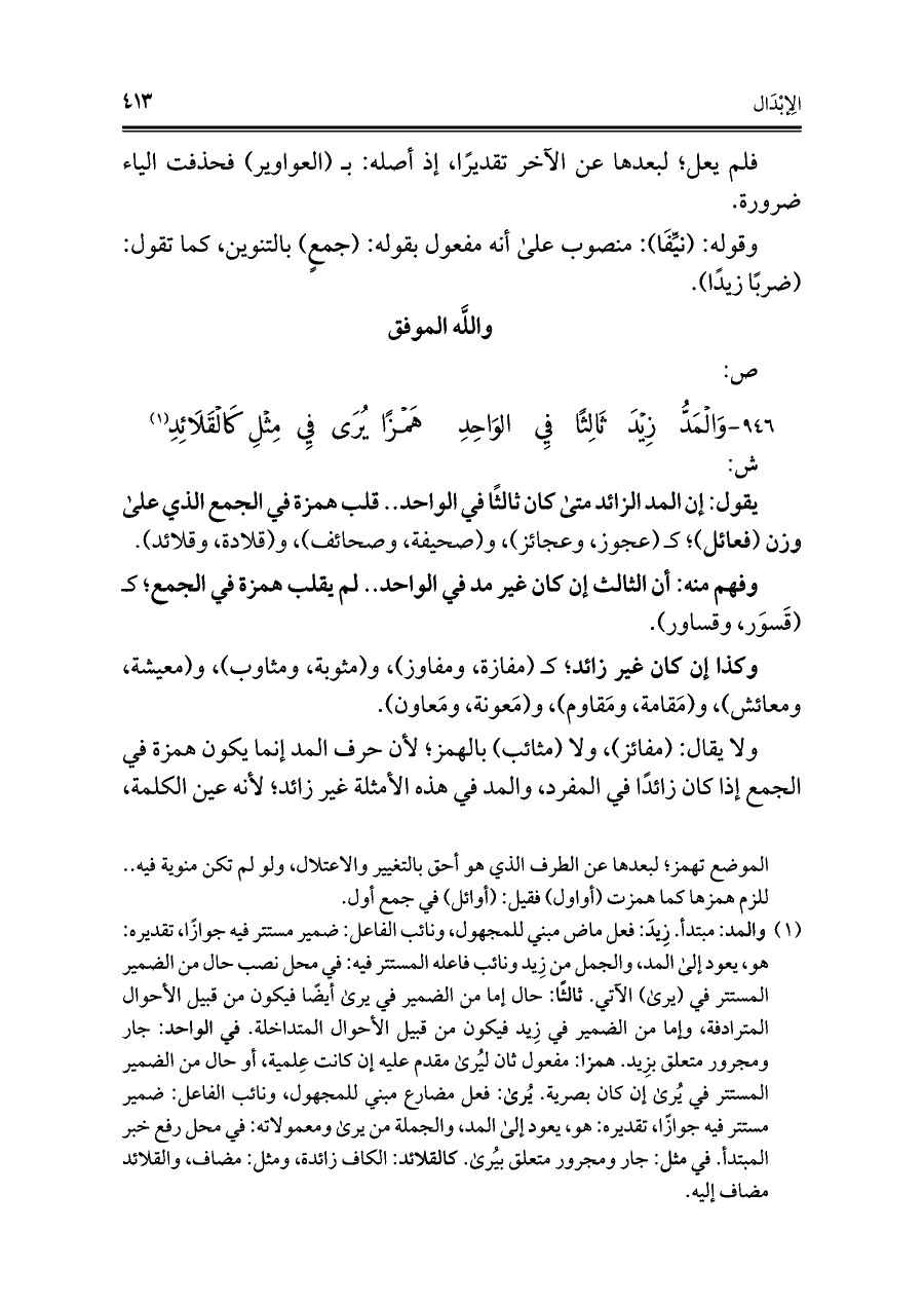 (¬١) والمد: مبتدأ. زِيدَ: فعل ماض مبني للمجهول، ونائب الفاعل: ضمير مستتر فيه جوازًا، تقديره: هو، يعود إلى المد، والجمل من زِيد ونائب فاعله المستتر فيه: في محل نصب حال من الضمير المستتر في (يرى) الآتي. ثالثًا: حال إما من الضمير في يرى أيضًا فيكون من قبيل الأحوال المترادفة، وإما من الضمير في زِيد فيكون من قبيل الأحوال المتداخلة. في الواحد: جار ومجرور متعلق بزِيد. همزا: مفعول ثان ليُرى مقدم عليه إن كانت عِلمية، أو حال من الضمير المستتر في يُرى إن كان بصرية. يُرى: فعل مضارع مبني للمجهول، ونائب الفاعل: ضمير مستتر فيه جوازًا، تقديره: هو، يعود إلى المد، والجملة من يرى ومعمولاته: في محل رفع خبر المبتدأ. في مثل: جار ومجرور متعلق بيُرى. كالقلائد: الكاف زائدة، ومثل: مضاف، والقلائد مضاف إليه.