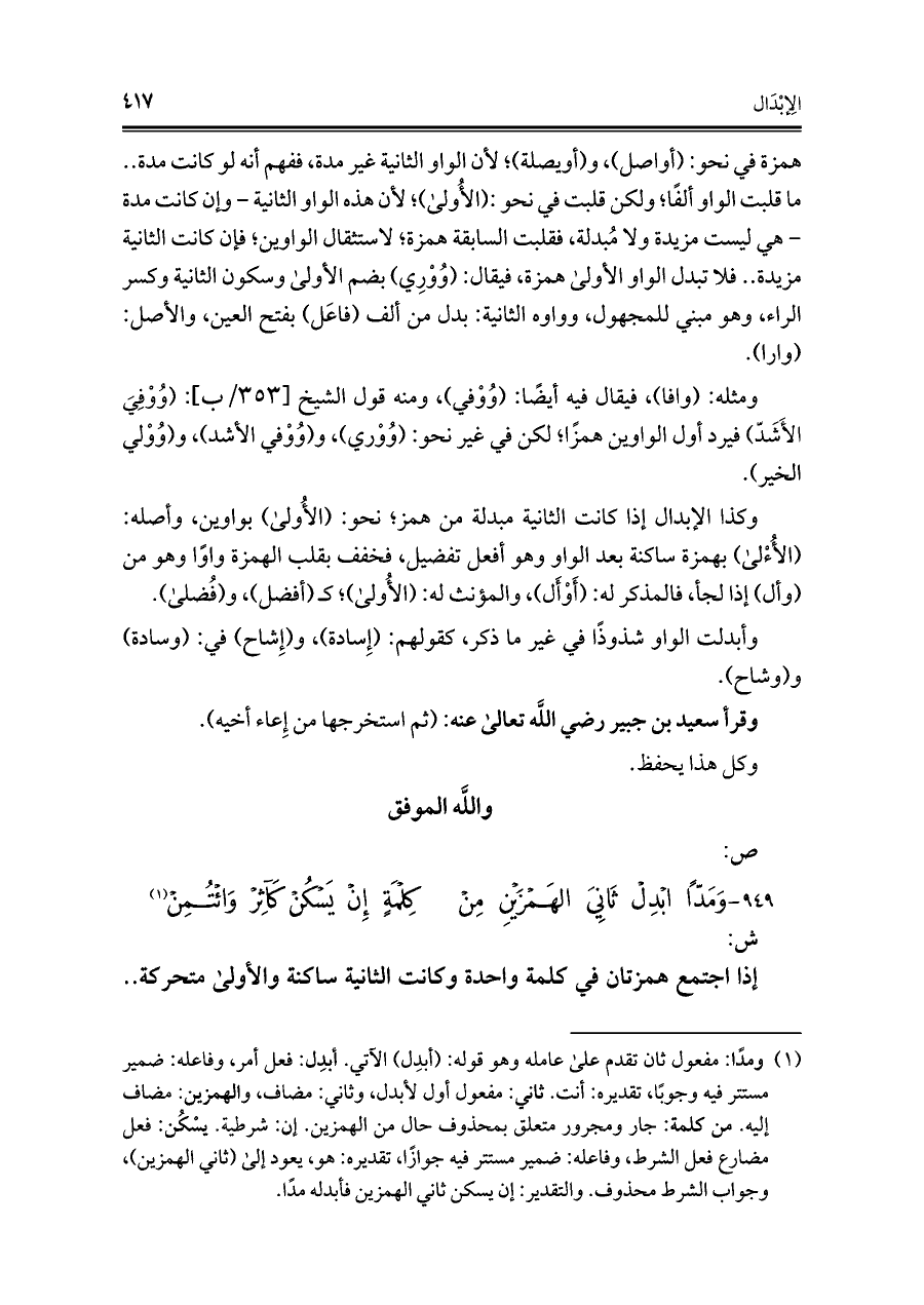 ٩٤٩ - وَمَدًّا ابْدِلْ ثَانِيَ الهَمْزَيْنِ مِنْ ... كِلْمَةٍ إِنْ يَسْكُنْ كَآثِرْ وَائْتُمِنْ (¬١)