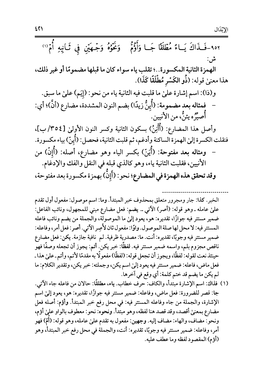 ٩٥٢ - فَذَاكَ يَاءً مُطْلَقًا جَا وَأَؤُمُّ ... وَنَحْوُهُ وَجْهَيْنِ فِي ثَانِيهِ أُمّ (¬١)