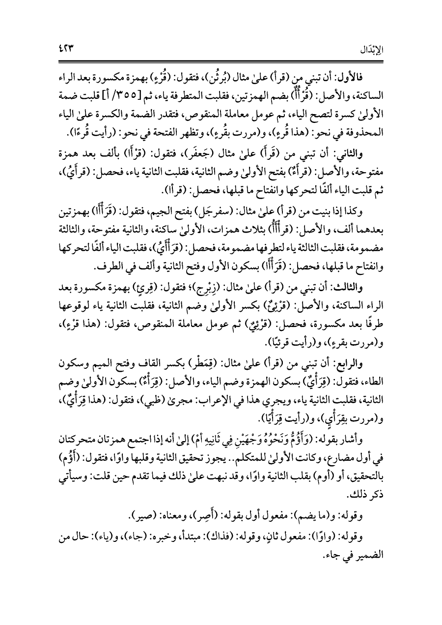 وكذا إذا بنيت من (قرأ) على مثال: (سفرجَل) بفتح الجيم، فتقول: (قَرَأْأَا) بهمزتين بعدهما ألف، والأصل: (قرأْأَأُ) بثلاث همزات، الأولى ساكنة، والثانية مفتوحة، والثالثة مضمومة، فقلبت الثالثة ياء لتطرفها مضمومة، فحصل: (قرَأْأَيُ)، فقلبت الياء ألفًا لتحركها وانفتاح ما قبلها، فحصل: (قَرَأْأَا) بسكون الأول وفتح الثانية وألف في الطرف.