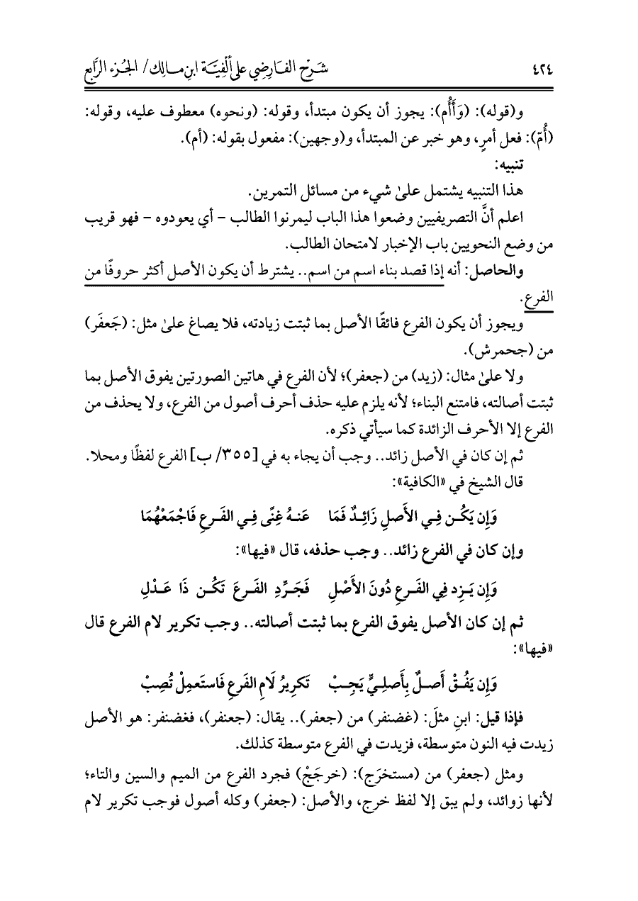 ويجوز أن يكون الفرع فائقًا الأصل بما ثبتت زيادته، فلا يصاغ على مثل: (جَعفَر) من (جحمرش).