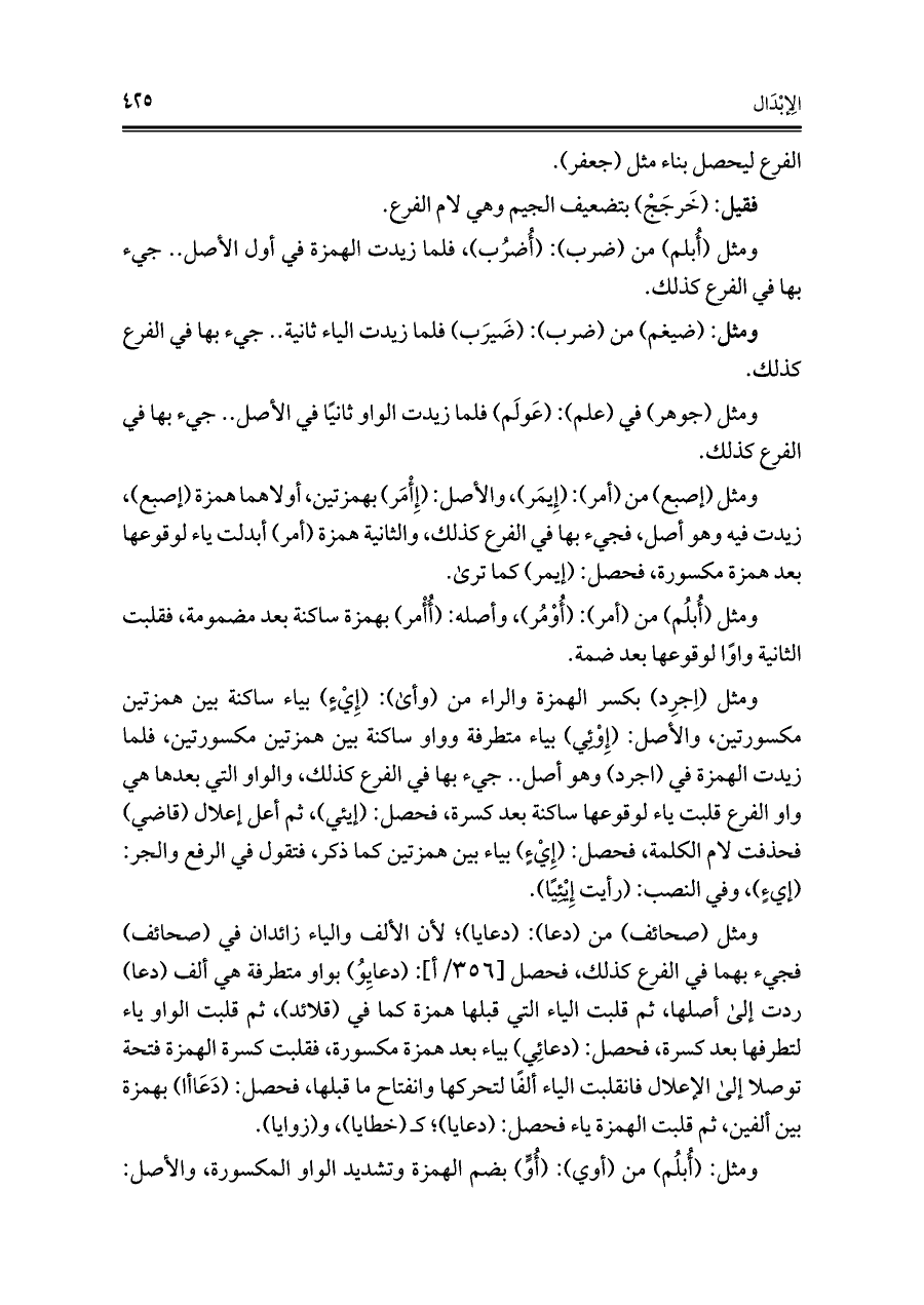 ومثل (صحائف) من (دعا): (دعايا)؛ لأن الألف والياء زائدان في (صحائف) فجيء بهما في الفرع كذلك، فحصل: (دعايِوُ) بواو متطرفة هي ألف (دعا) ردت إلى أصلها، ثم قلبت الياء التي قبلها همزة كما في (قلائد)، ثم قلبت الواو ياء لتطرفها بعد كسرة، فحصل: (دعائِي) بياء بعد همزة مكسورة، فقلبت كسرة الهمزة فتحة توصلا إلى الإعلال فانقلبت الياء ألفًا لتحركها وانفتاح ما قبلها، فحصل: (دَعَاأا) بهمزة بين ألفين، ثم قلبت الهمزة ياء فحصل: (دعايا)؛ كـ (خطايا)، و (زوايا).