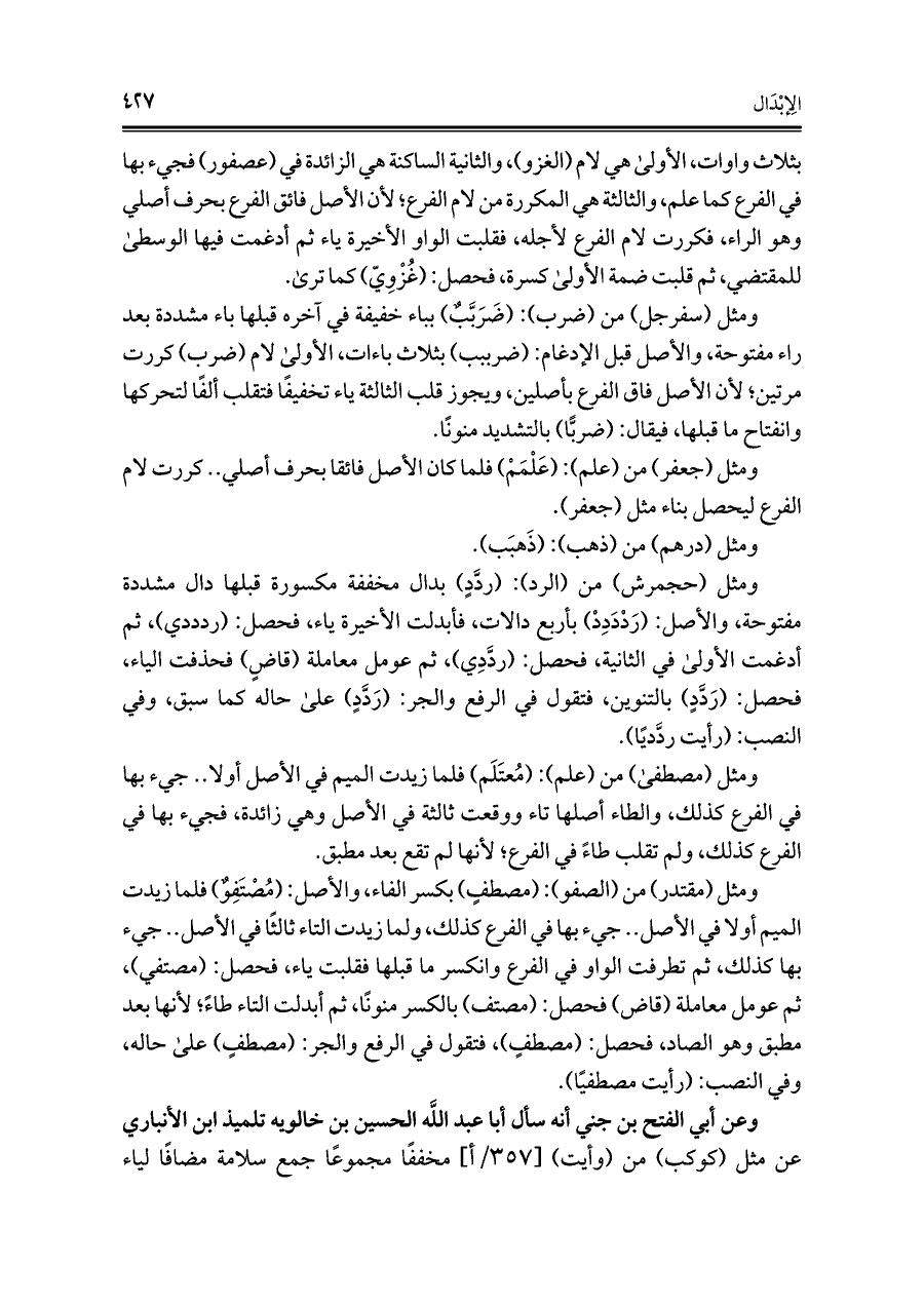 وعن أبي الفتح بن جني أنه سأل أبا عبد الله الحسين بن خالويه تلميذ ابن الأنباري عن مثل (كوكب) من (وأيت)، مخففًا مجموعًا جمع سلامة مضافًا لياء