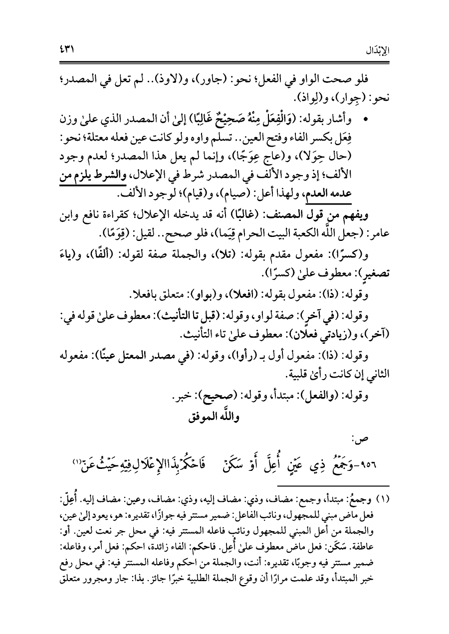 (¬١) وجمعُ: مبتدأ، وجمع: مضاف، وذي: مضاف إليه، وذي: مضاف، وعين: مضاف إليه. أُعِلّ: فعل ماض مبني للمجهول، ونائب الفاعل: ضمير مستتر فيه جوازًا، تقديره: هو، يعود إلى عين، والجملة من أعل المبني للمجهول ونائب فاعله المستتر فيه: في محل جر نعت لعين. أو: عاطفة. سَكَن: فعل ماض معطوف على أُعِل. فاحكم: الفاء زائدة، احكم: فعل أمر، وفاعله: ضمير مستتر فيه وجوبًا، تقديره: أنت، والجملة من احكم وفاعله المستتر فيه: في محل رفع خبر المبتدأ، وقد علمت مرارًا أن وقوع الجملة الطلبية خبرًا جائز. بذا: جار ومجرور متعلق=