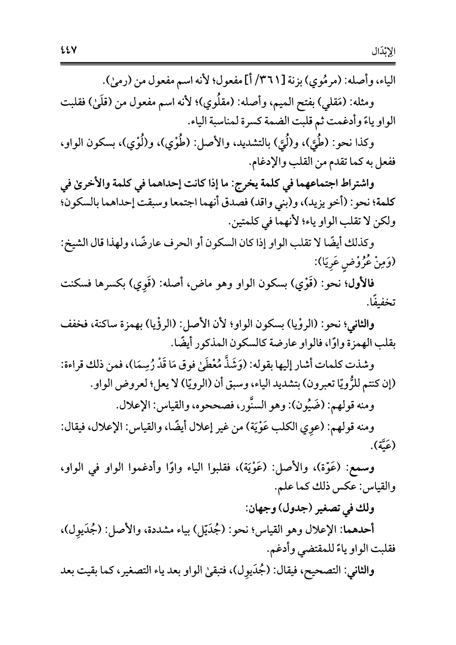 أحدهما: الإعلال وهو القياس؛ نحو: (جُدَيّل) بياء مشددة، والأصل: (جُدَيوِل)، فقلبت الواو ياءً للمقتضي وأدغم.
