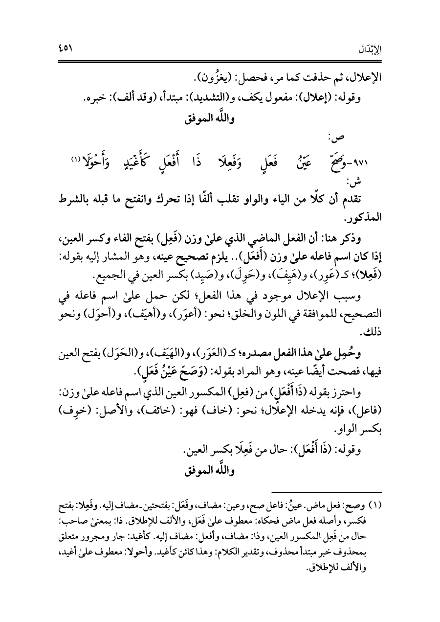 ٩٧١ - وَصَحّ عَيْنُ فَعَلٍ وَفَعِلَا ... ذَا أَفْعَلٍ كَأَغْيَدٍ وَأَحْوَلَا (¬١)