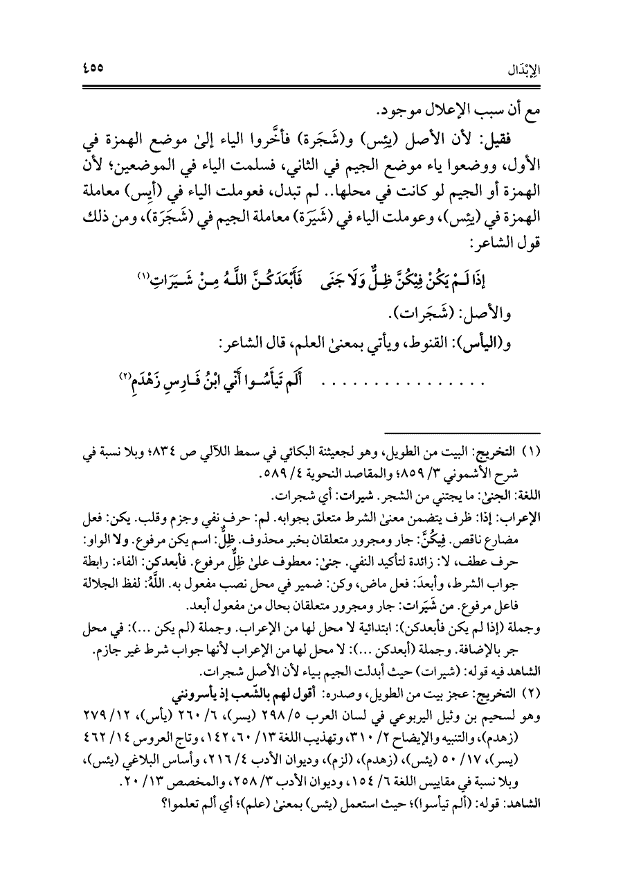 فقيل: لأن الأصل (يئِس) و (شَجَرة) فأخَّروا الياء إلى موضع الهمزة في الأول، ووضعوا ياء موضع الجيم في الثاني، فسلمت الياء في الموضعين؛ لأن الهمزة أو الجيم لو كانت في محلها .. لم تبدل، فعوملت الياء في (أيس) معاملة الهمزة في (يئِس)، وعوملت الياء في (شَيَرَة) معاملة الجيم في (شَجَرَة)، ومن ذلك قول الشاعر: