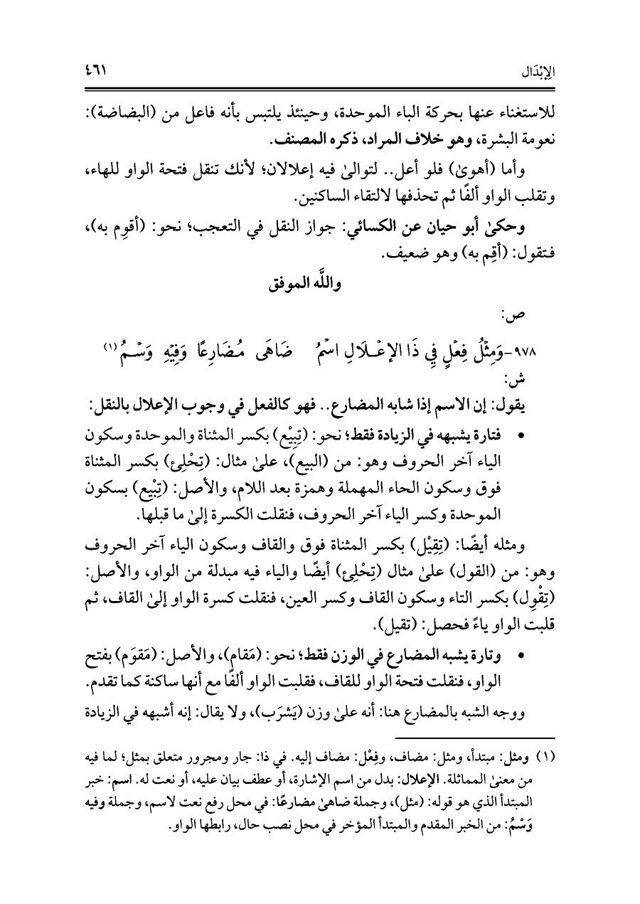 (¬١) ومثل: مبتدأ، ومثل: مضاف، وفِعْل: مضاف إليه. في ذا: جار ومجرور متعلق بمثل؛ لما فيه من معنى المماثلة. الإعلال: بدل من اسم الإشارة، أو عطف بيان عليه، أو نعت له. اسم: خبر المبتدأ الذي هو قوله: (مثل)، وجملة ضاهى مضارعًا: في محل رفع نعت لاسم، وجملة وفيه وَسْمُ: من الخبر المقدم والمبتدأ المؤخر في محل نصب حال، رابطها الواو.