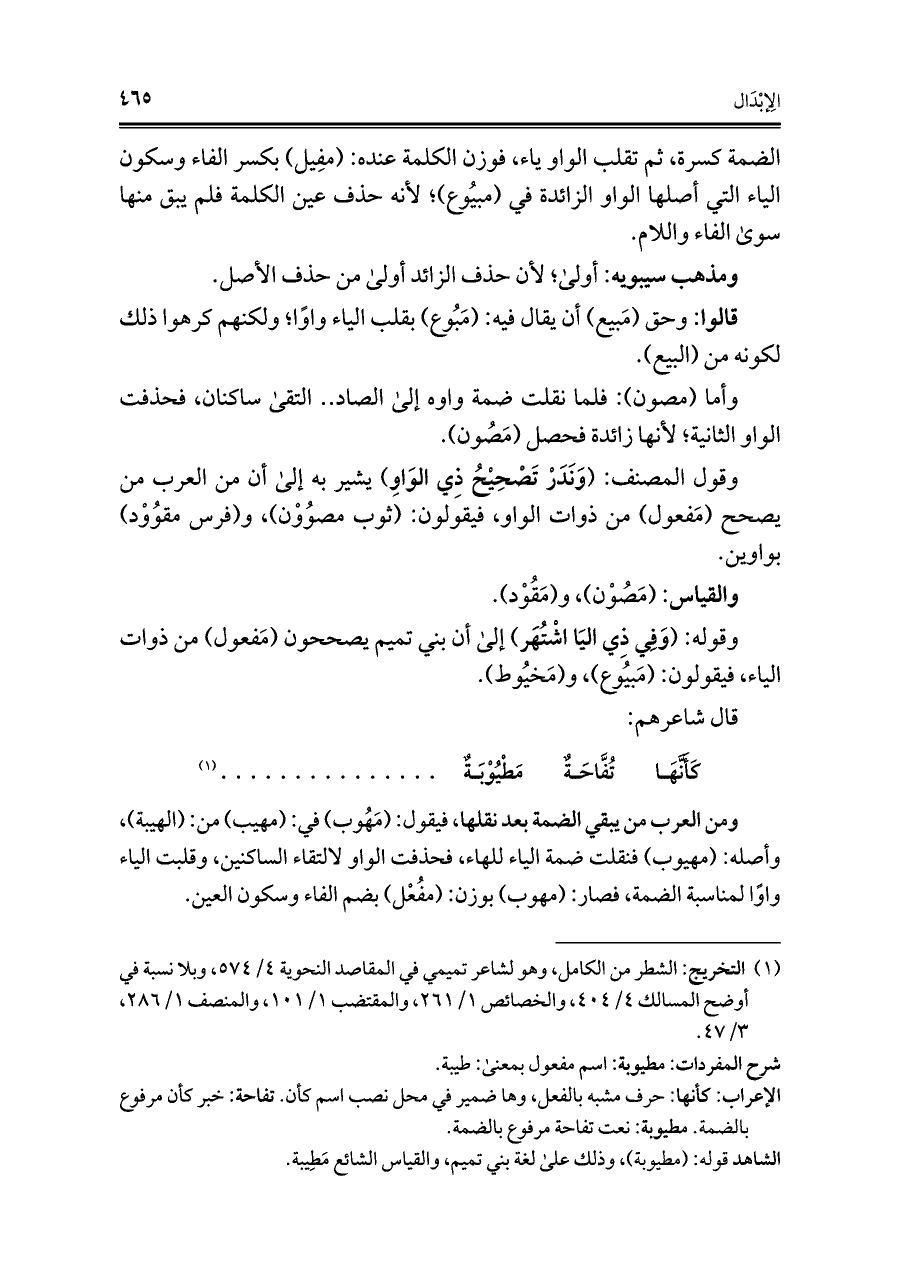 ومن العرب من يبقي الضمة بعد نقلها، فيقول: (مَهُوب) في: (مهيب) من: (الهيبة)، وأصله: (مهيوب) فنقلت ضمة الياء للهاء، فحذفت الواو لالتقاء الساكنين، وقلبت الياء واوًا لمناسبة الضمة، فصار: (مهوب) بوزن: (مفُعْل) بضم الفاء وسكون العين.