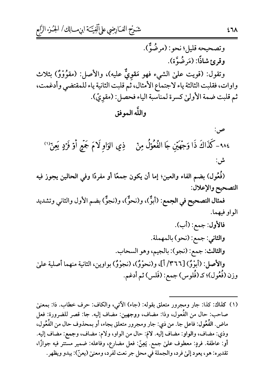 ٩٨٤ - كَذَاكَ ذَا وَجهَينِ جَا الفُعُولُ مِنْ ... ذِي الوَاوِ لَامَ جَمعٍ أوْ فَرْدٍ يَعِنّ (¬١)