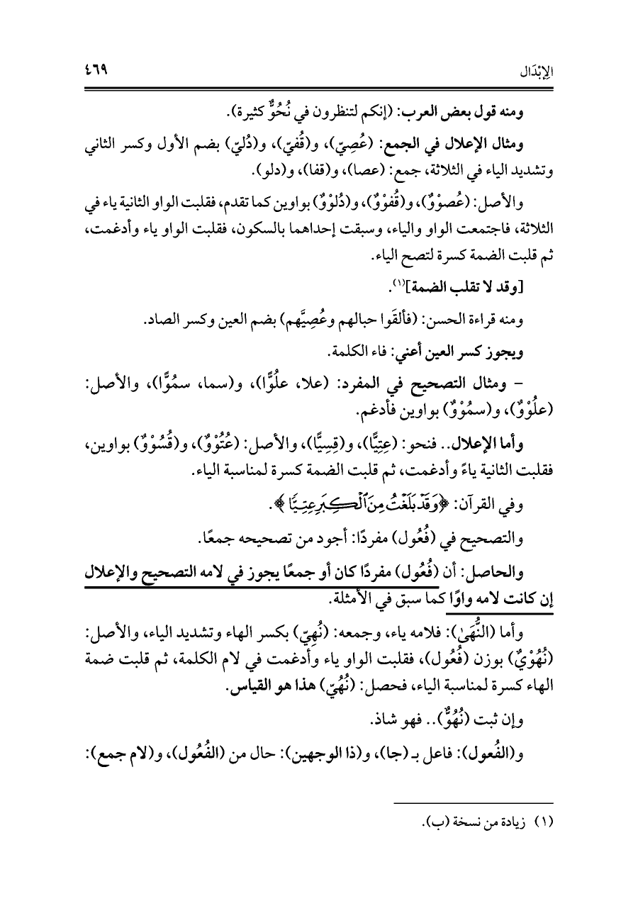 ومثال الإعلال في الجمع: (عُصِيّ)، و (قُفيّ)، و (دُليّ) بضم الأول وكسر الثاني وتشديد الياء في الثلاثة، جمع: (عصا)، و (قفا)، و (دلو).