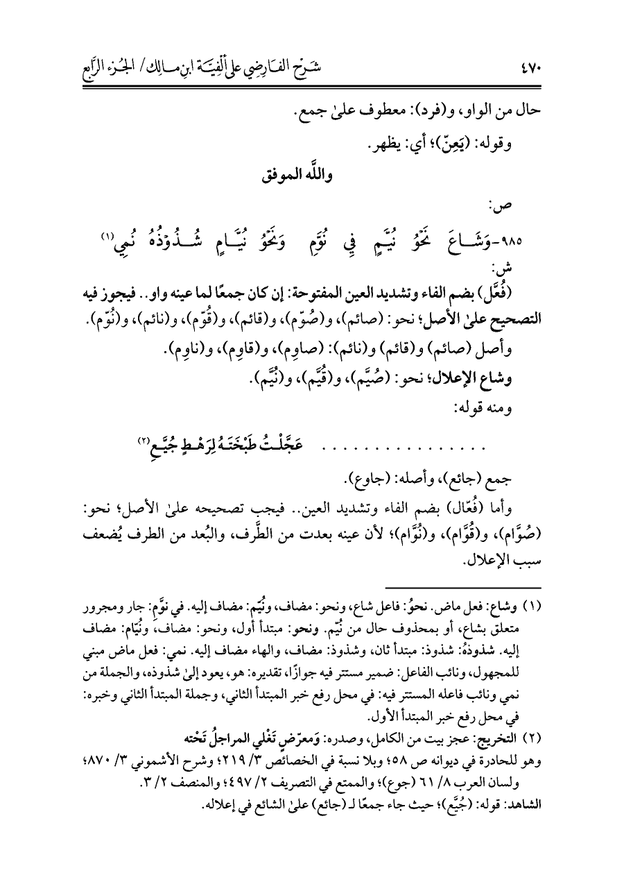 (فُعَّل) بضم الفاء وتشديد العين المفتوحة: إن كان جمعًا لما عينه واو .. فيجوز فيه التصحيح على الأصل؛ نحو: (صائم)، و (صُوّم)، و (قائم)، و (قُوّم)، و (نائم)، و (نُوّم).