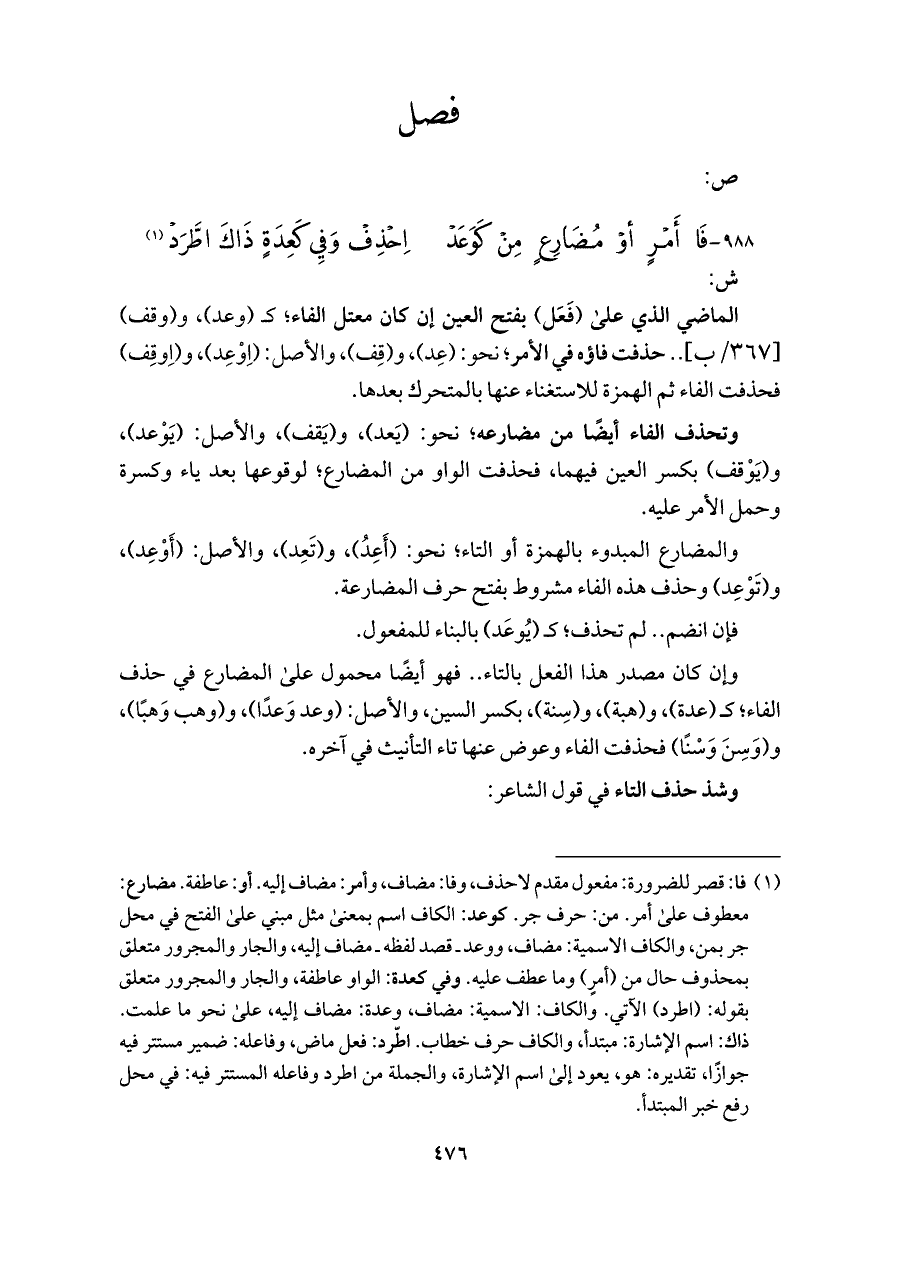 ٩٨٨ - فَا أَمْرٍ أوْ مُضَارِعٍ مِنْ كَوَعَدْ ... اِحْذِف وَفِي كَعِدَةٍ ذَاكَ اطَّرَد (¬١)