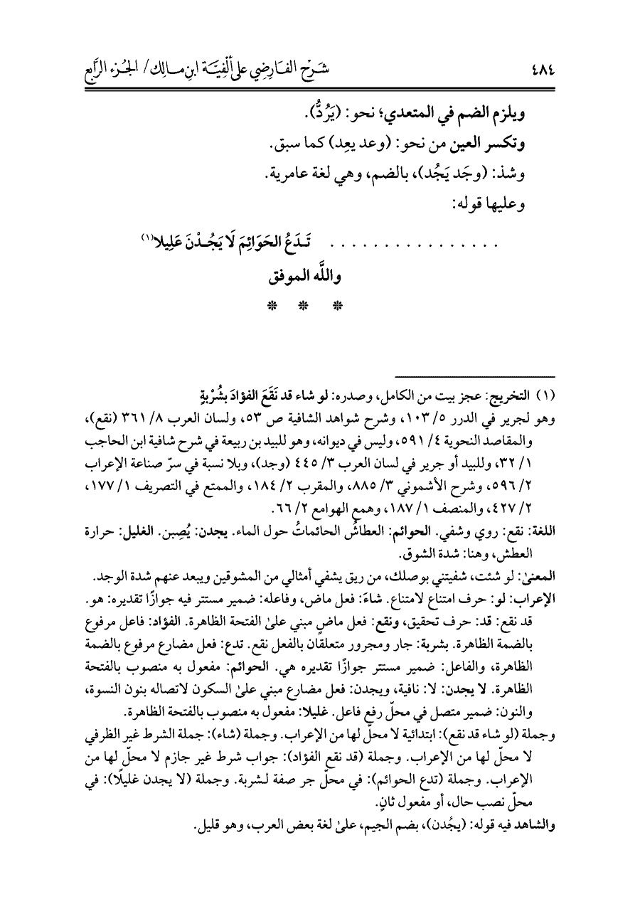 الإعراب: لو: حرف امتناع لامتناع. شاءَ: فعل ماض، وفاعله: ضمير مستتر فيه جوازًا تقديره: هو. قد نقع: قد: حرف تحقيق، ونقع: فعل ماضٍ مبني على الفتحة الظاهرة. الفؤاد: فاعل مرفوع بالضمة الظاهرة. بشربة: جار ومجرور متعلقان بالفعل نقع. تدع: فعل مضارع مرفوع بالضمة الظاهرة، والفاعل: ضمير مستتر جوازًا تقديره هي. الحوائم: مفعول به منصوب بالفتحة الظاهرة. لا يجدن: لا: نافية، ويجدن: فعل مضارع مبني على السكون لاتصاله بنون النسوة، والنون: ضمير متصل في محلّ رفع فاعل. غليلا: مفعول به منصوب بالفتحة الظاهرة.