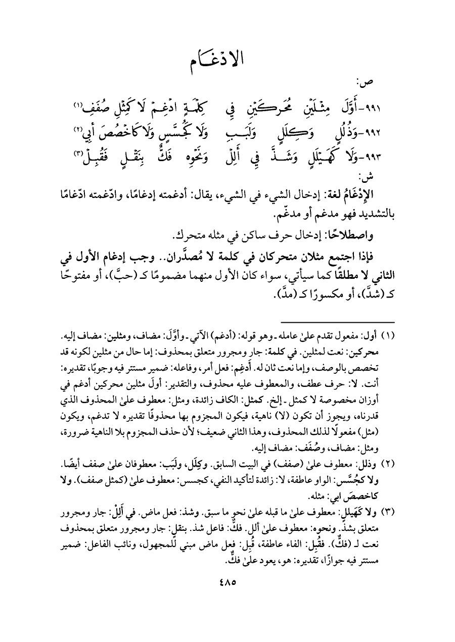 ٩٩١ - أَوَّلَ مِثْلَيْنِ مُحَركَيْنِ فيِ ... كِلْمَةٍ ادغِمْ لَا كَمِثْلِ صُفَفِ (¬١)