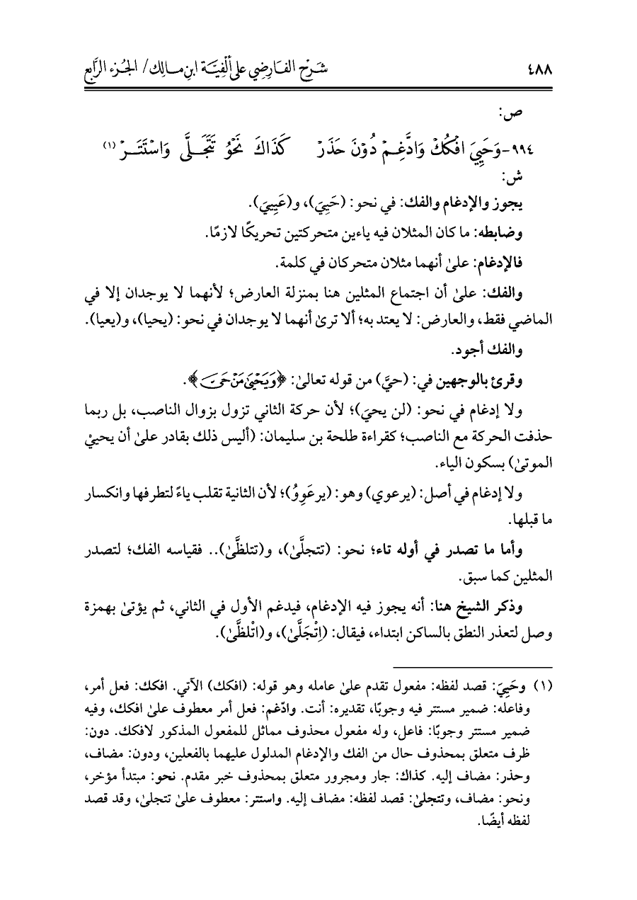 ٩٩٤ - وَحَيِىَ اْفْكُكْ وَادَّغِمْ دُوْنَ حَذَرْ ... كَذَاكَ نَحْوُ تَتَجَلَّى وَاسْتَتَر (¬١)