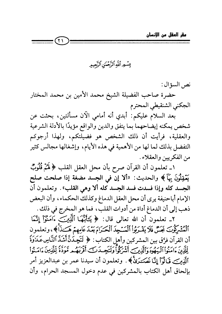 ١ - تعلمون أن القرآن صرح بأن محل العقل القلب {لَهُمْ قُلُوبٌ يَعْقِلُونَ بِهَا} والحديث: "ألا إن في الجسد مضغة إذا صلحت صلح الجسد كله وإذا فسدت فسد الجسد كله ألا وهي القلب". وتعلمون أن الإمام أبا حنيفة يرى أن محل العقل الدماغ وكذلك الحكماء، وأن البعض ذهب إلى أن الدماغ أداة من أدوات القلب، فما هو المخرج في ذلك.