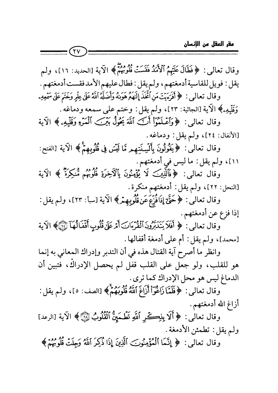 وقال تعالى: {أَفَلَا يَتَدَبَّرُونَ الْقُرْآنَ أَمْ عَلَى قُلُوبٍ أَقْفَالُهَا (٢٤)} الآية [محمد: ٢٤]، ولم يقل: (أم) [٣] على أدمغة أقفالها.