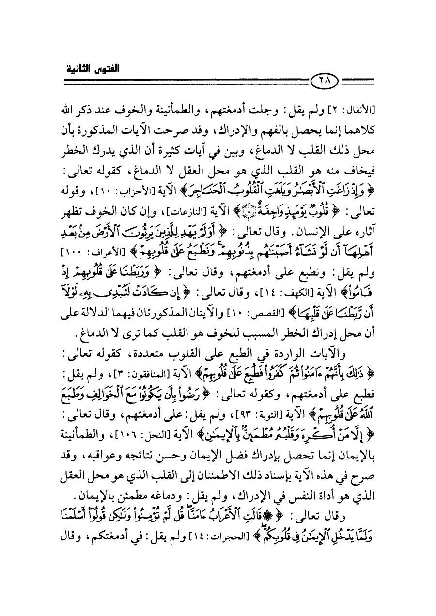 [الأنفال: ٢] ولم يقل: وجلت أدمغتهم، والطمأنينة والخوف عند ذكر الله كلاهما إنما يحصل بالفهم والإدراك، وقد صرحت الآيات المذكورة بأن محل ذلك القلب لا الدماغ، وبين في آيات كثيرة أن الذي يدرك الخطر فيخاف منه هو القلب الذي هو محل العقل لا الدماغ، كقوله تعالى: {وَإِذْ زَاغَتِ الْأَبْصَارُ وَبَلَغَتِ الْقُلُوبُ الْحَنَاجِرَ} الآية [الأحزاب: ١٠]، (وقوله) [١] تعالى: {قُلُوبٌ يَوْمَئِذٍ وَاجِفَةٌ (٨)} الآية [النازعات: ٨]، وإن كان الخوف تظهر آثاره على الإنسان. وقال تعالى: {أَوَلَمْ يَهْدِ لِلَّذِينَ يَرِثُونَ الْأَرْضَ مِنْ بَعْدِ أَهْلِهَا أَنْ لَوْ نَشَاءُ أَصَبْنَاهُمْ بِذُنُوبِهِمْ وَنَطْبَعُ عَلَى قُلُوبِهِمْ} [الأعراف: ١٠٠] ولم يقل: (ونطبع) [٢] على أدمغتهم، وقال تعالى: {وَرَبَطْنَا عَلَى قُلُوبِهِمْ إِذْ قَامُوا} الآية [الكهف: ١٤]، وقال تعالى: {إِنْ كَادَتْ لَتُبْدِي بِهِ لَوْلَا أَنْ رَبَطْنَا عَلَى قَلْبِهَا} [القصص: ١٠] والآيتان المذكورتان فيهما [من] [٣] الدلالة على أن محل إدراك الخطر المسبب للخوف هو القلب كما ترى لا الدماغ.
