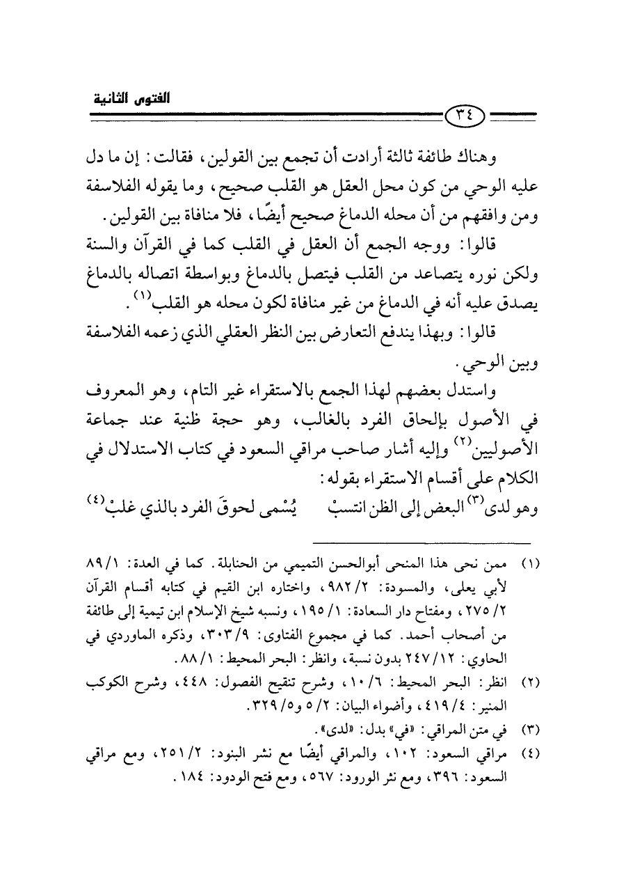 قالوا: ووجه الجمع أن العقل في القلب كما في القرآن والسنة ولكن نوره يتصاعد من القلب فيتصل بالدماغ وبواسطة اتصاله بالدماغ يصدق عليه أنه في الدماغ من غير منافاة لكون محله هو القلب (¬١).