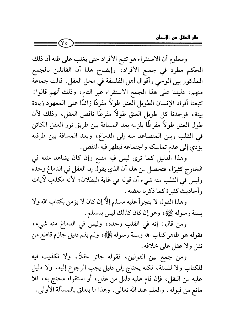 ومعلوم أن الاستقراء هو تتبع الأفراد حتى يغلب على ظنه أن ذلك الحكم مطرد في جميع الأفراد، وإيضاح هذا أن القائلين بالجمع المذكور بين الوحي وأقوال أهل الفلسفة في محل العقل. قالت جماعة منهم: دليلنا على هذا الجمع الاستقراء غير التام، وذلك أنهم قالوا: تتبعنا أفراد الإنسان الطويل العنق طولًا مفردًا زائدًا على المعهود زيادة بينة، فوجدنا كل طويل العنق طولًا مفرطًا ناقص العقل، وذلك لأن طول العنق طولًا مفرطًا يلزمه بعد المسافة بين طريق نور العقل الكائن في القلب وبين المتصاعد منه إلى الدماغ، وبعد المسافة بين طرفيه يؤدي إلى عدم تماسكه واجتماعه فيظهر فيه النقص.