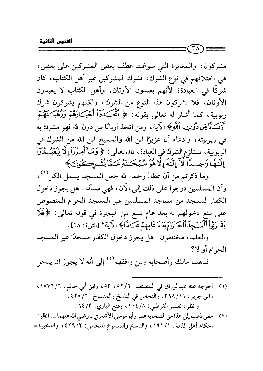 وما ذكرتم من أن عطاءً رحمه الله جعل المسجد يشمل (الكل) [٢] (¬١)، وأن المسلمين درجوا على ذلك إلى الآن، فهي مسألة: هل يجوز دخول الكفار لمسجد من مساجد المسلمين غير المسجد الحرام المنصوص على منع دخولهم له بعد عام تسع من الهجرة في قوله تعالى: {فَلَا يَقْرَبُوا الْمَسْجِدَ الْحَرَامَ بَعْدَ عَامِهِمْ هَذَا} [التوبة: ٢٨].