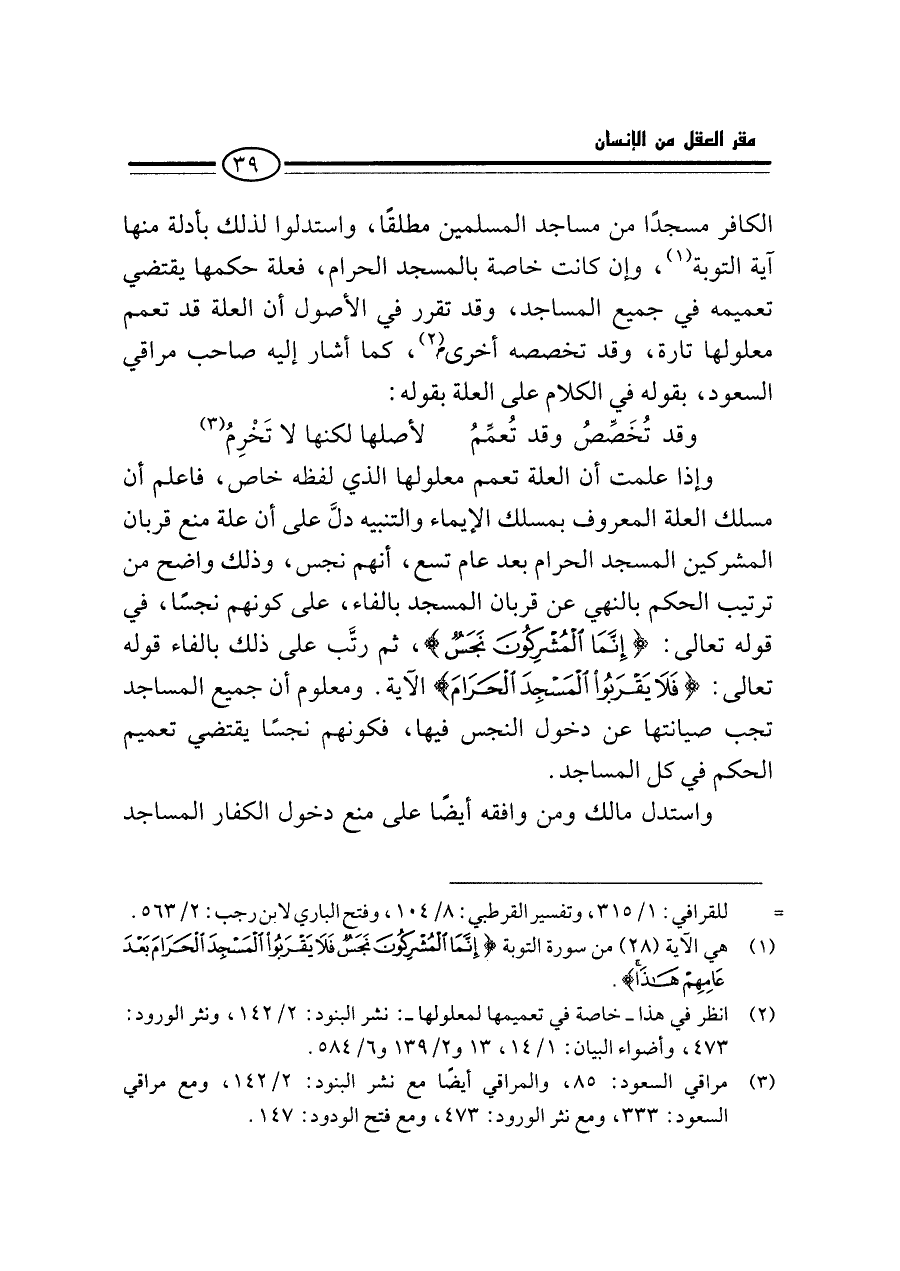 الكافر مسجدًا من مساجد المسلمين مطلقًا، واستدلوا لذلك بأدلة منها آية التوبة (¬١)، وإن كانت خاصة بالمسجد الحرام، فعلة حكمها (يقتضي) [١] تعميمه في جميع المساجد، وقد تقرر في الأصول أن العلة قد تعمم معلولها تارة، وقد تخصصه (أخرى) [٢] (¬٢)، كما أشار إليه صاحب مراقي السعود، بقوله في الكلام على العلة (بقوله) [٣]: