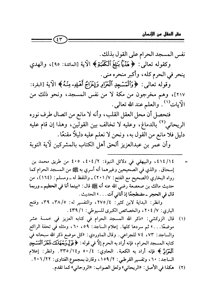 فتحصل أن محل العقل القلب، وأنه لا مانع من اتصال طرف نوره الريحاني (¬٢) بالدماغ، وعليه لا تخالف بين القولين، و [أن] [٢] هذا إن قام عليه دليل فلا مانع من (القول به) [٣]، ونحن لا نعلم عليه دليلا مقنعًا.