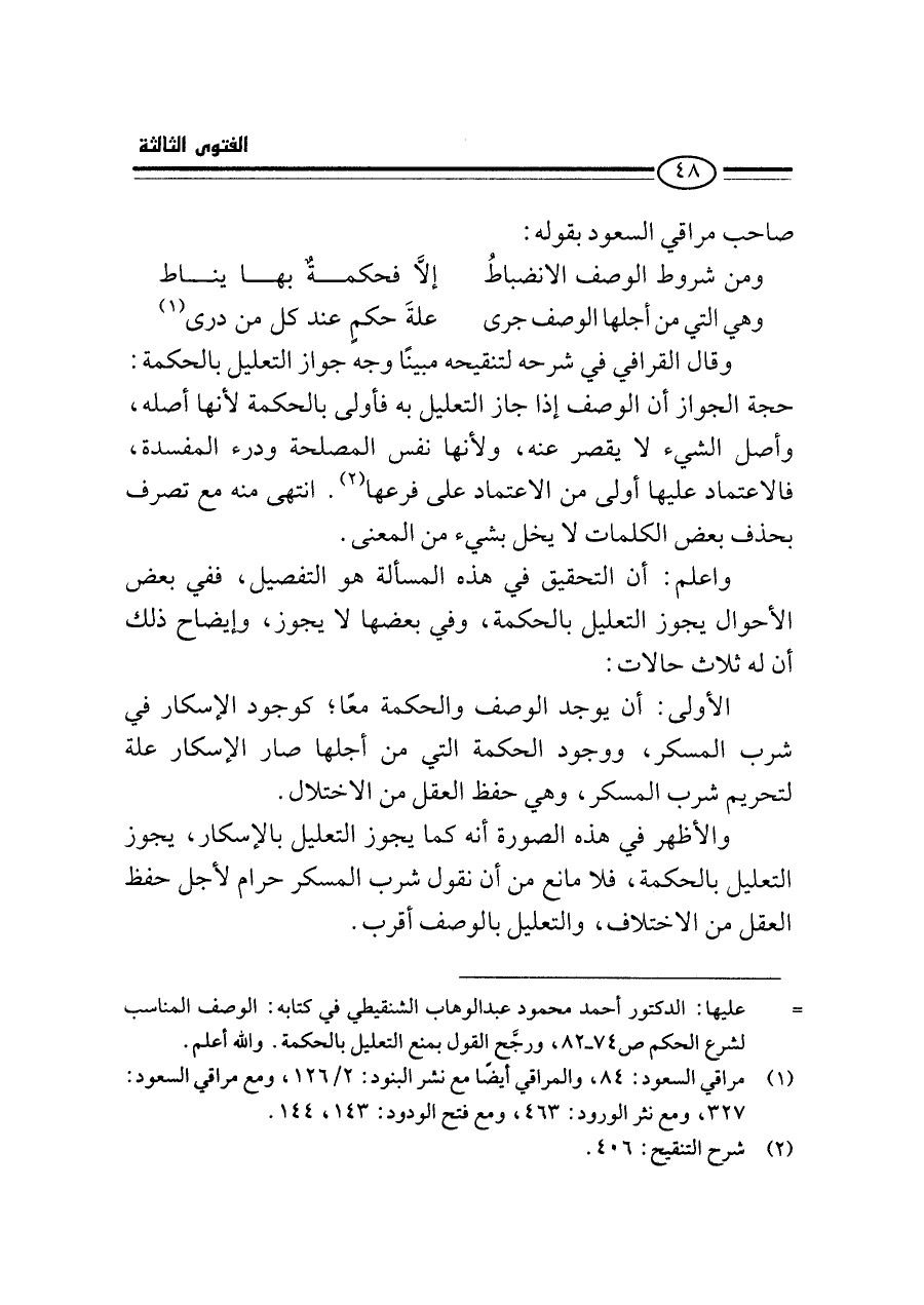 = عليها: الدكتور أحمد محمود عبد الوهاب الشنقيطي في كتابه: الوصف المناسب لشرع الحكم ص ٧٤ - ٨٢، ورجَّح القول بمنع التعليل بالحكمة. والله أعلم.