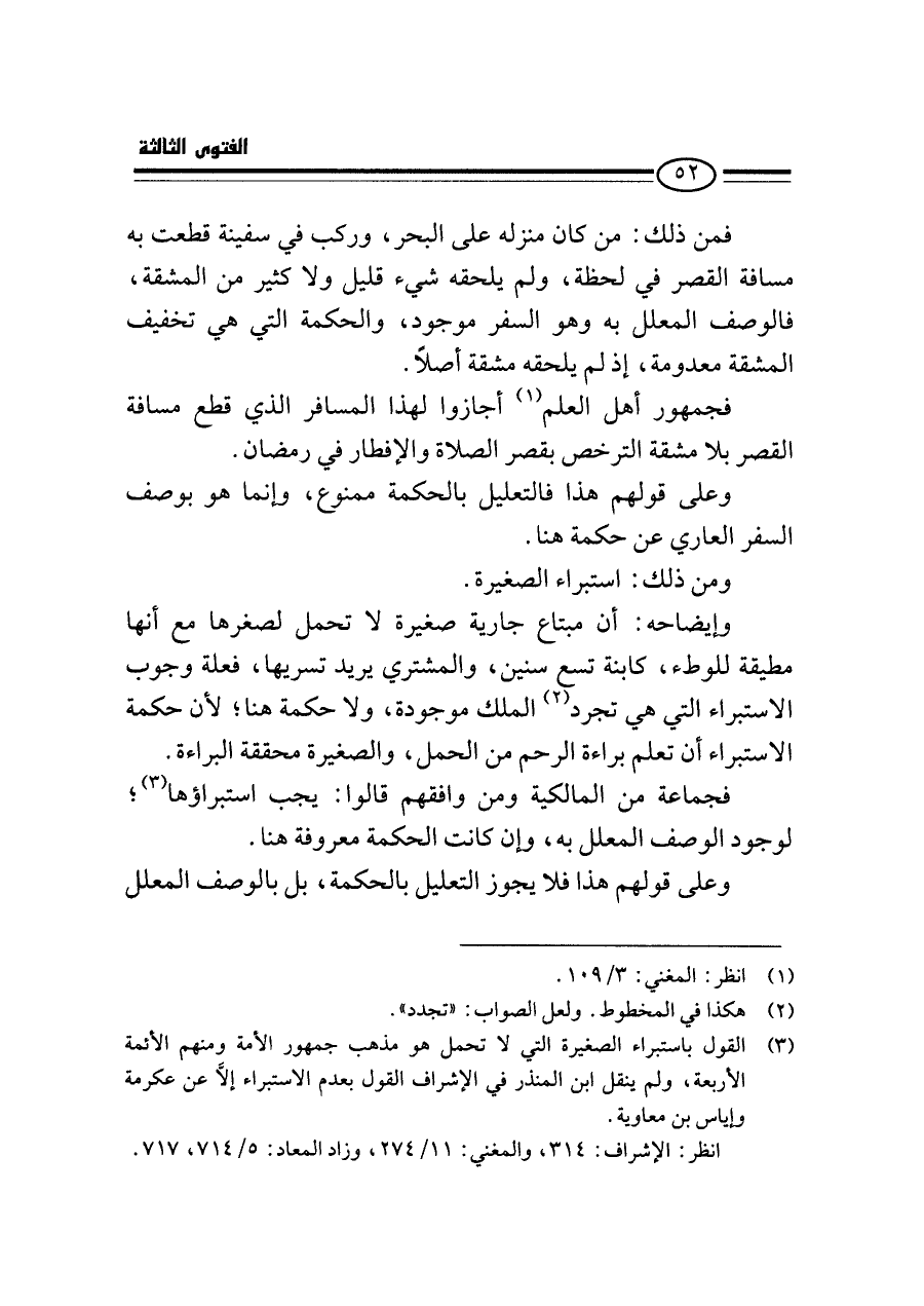 (¬٣) القول باستبراء الصغيرة التي لا تحمل هو مذهب جمهور الأمة ومنهم الأئمة الأربعة، ولم ينقل ابن المنذر في الإشراف القول بعدم الاستبراء إلا عن عكرمة وإياس بن معاوية.