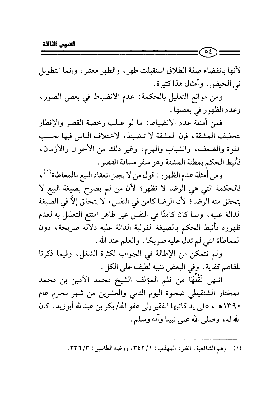 انتهى نَقْلُهَا من قلم المؤلف الشيخ محمد الأمين بن محمد المختار الشنقيطي ضحوة اليوم الثاني والعشرين من شهر محرم عام ١٣٩٠ هـ، على يد كاتبها الفقير إلى عفو الله/ بكر بن عبد الله أبو زيد. كان الله له، وصلى الله على نبينا وآله وسلم.