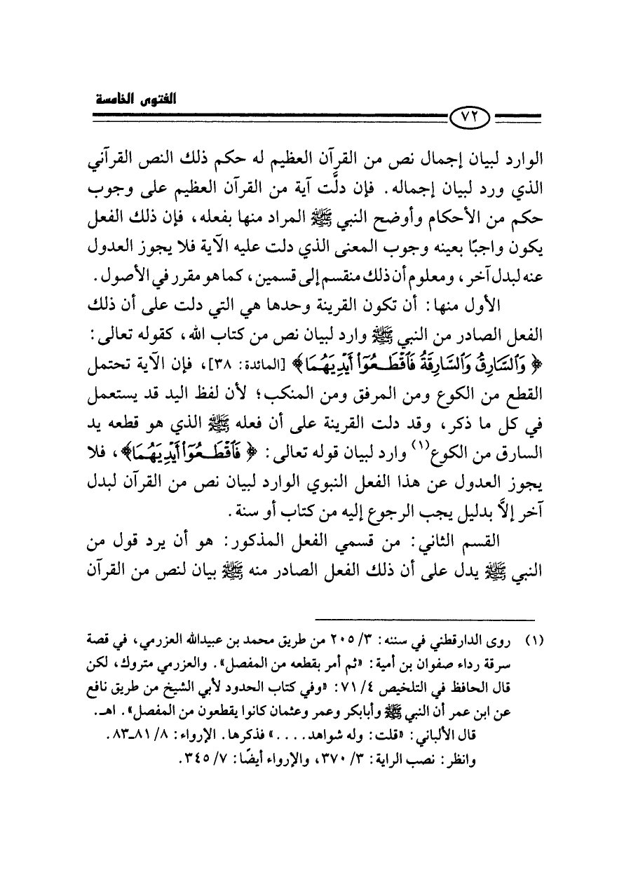 الأول منها: أن تكون القرينة وحدها هي التي دلت على أن ذلك الفعل الصادر من النبي - صلى الله عليه وسلم - وارد لبيان نص من كتاب الله، كقوله تعالى: {وَالسَّارِقُ وَالسَّارِقَةُ فَاقْطَعُوا أَيدِيَهُمَا} [المائدة: ٣٨]، فإن الآية تحتمل القطع من الكوع ومن المرفق ومن المنكب؛ لأن لفظ اليد قد يستعمل في كل ما ذكر، وقد دلت القرينة على أن فعله - صلى الله عليه وسلم - الذي هو قطعه يد السارق من الكوع (¬١) وارد لبيان قوله تعالى: {فَاقْطَعُوا أَيدِيَهُمَا}، فلا يجوز العدول عن هذا الفعل النبوي الوارد لبيان نص من القرآن لبدل آخر إلَّا بدليل يجب الرجوع إليه من كتاب أو سنة.