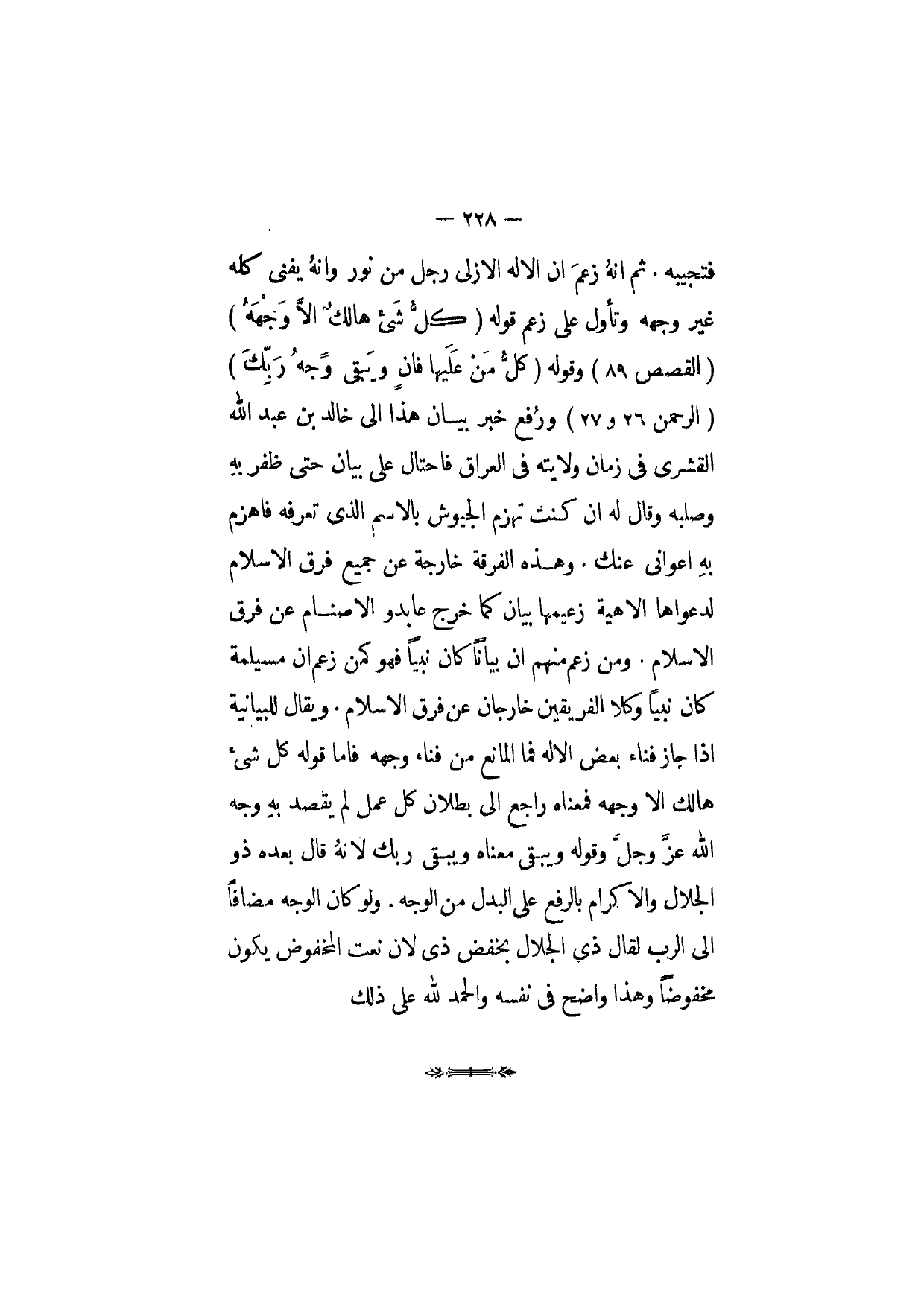 فتجيبه ثمَّ انه زعم ان الاله الازلى رجل من نور وانه يفنى كُله غير وَجهه وَتَأَول على زعم قَوْله {كل شَيْء هَالك إِلَّا وَجهه} وَقَوله {كل من عَلَيْهَا فان وَيبقى وَجه رَبك} وَرفع خبر بَيَان هَذَا الى خَالِد بن عبد الله القشري فى زمَان ولَايَته فى الْعرَاق فاحتال على بَيَان حَتَّى ظفر بِهِ وصلبه وَقَالَ لَهُ ان كنت تهزم الجيوش بِالِاسْمِ الذى تعرفه فاهزم بِهِ اعوانى عَنْك وَهَذِه الْفرْقَة خَارِجَة عَن جَمِيع فرق الاسلام لدعواها الاهية زعيمها بَيَان كَمَا خرج عابدو الاصنام عَن فرق الاسلام وَمن زعم مِنْهُم ان بَيَانا كَانَ نَبيا فَهُوَ كمن زعم ان مُسَيْلمَة كَانَ نَبيا وكلا الْفَرِيقَيْنِ خارجان عَن فرق الاسلام وَيُقَال للبيانية اذا جَازَ فنَاء بعض الاله فَمَا الْمَانِع من فنَاء وَجهه فاما قَوْله كل شىء هَالك الا وَجهه فَمَعْنَاه رَاجع الى بطلَان كل عمل لم يقْصد بِهِ وَجه الله عز وَجل وَقَوله وَيبقى مَعْنَاهُ وَيبقى رَبك لانه قَالَ بعده ذُو الْجلَال والاكرام بِالرَّفْع على الْبَدَل من الْوَجْه وَلَو كَانَ الْوَجْه مُضَافا الى الرب لقَالَ ذى الْجلَال بخفض ذى لَان نعت المخفوض يكون مخفوضا وَهَذَا وَاضح فى نَفسه وَالْحَمْد لله على ذَلِك