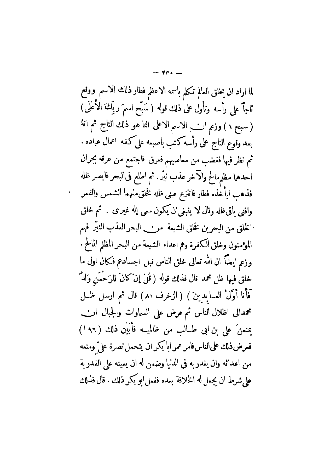 لما اراد ان يخلق الْعَالم تكلم باسمه الاعظم فطار ذَلِك الِاسْم وَوَقع تاجا على رَأسه وَتَأَول على ذَلِك قَوْله {سبح اسْم رَبك الْأَعْلَى} وَزعم ان الِاسْم الاعلى انما هُوَ ذَلِك التَّاج ثمَّ انه بعد وُقُوع التَّاج على رَأسه كتب باصبعه على كَفه اعمال عباده ثمَّ نظر فِيهَا فَغَضب من معاصيهم فعرق فَاجْتمع من عرقه بحران احدهما مظلم مالح وَالْآخر عذب نير ثمَّ اطلع فِي الْبَحْر فابصر ظله فَذهب ليأخذه فطار فَانْتزع عينى ظله فخلق مِنْهُمَا الشَّمْس وَالْقَمَر وافنى باقى ظله وَقَالَ لَا ينبغى ان يكون معى إِلَه غيرى ثمَّ خلق الْخلق من الْبَحْرين فخلق الشِّيعَة من الْبَحْر العذب النير فهم الْمُؤْمِنُونَ وَخلق الْكَفَرَة وهم اعداء الشِّيعَة من الْبَحْر المظلم المالح وَزعم ايضا ان الله تَعَالَى خلق النَّاس قبل اجسادهم فَكَانَ اول مَا خلق فِيهَا ظلّ مُحَمَّد قَالَ فَذَلِك قَوْله {قل إِن كَانَ للرحمن ولد فَأَنا أول العابدين} قَالَ ثمَّ ارسل ظلّ مُحَمَّد الى أظلال النَّاس ثمَّ عرض على السَّمَاوَات وَالْجِبَال ان يمنعن على بن ابى طَالب من ظالميه فأبين ذَلِك فَعرض ذَلِك على النَّاس فامر عمر ابا بكر ان يتَحَمَّل نَصره على وَمنعه من اعدائه وان يغدر بِهِ فى الدُّنْيَا وَضمن لَهُ ان يُعينهُ على الْقَدَرِيَّة على شَرط ان يَجْعَل لَهُ الْخلَافَة بعده فَفعل ابو بكر ذَلِك قَالَ فَذَلِك