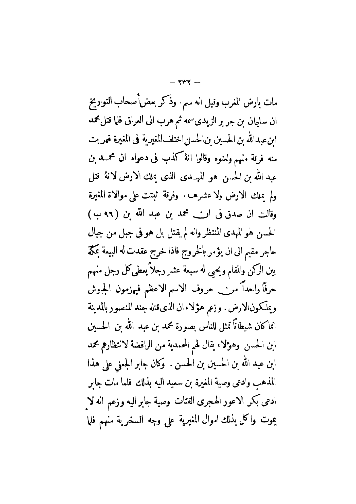 مَاتَ بارض الْمغرب وَقيل انه سم وَذكر بعض اصحاب التواريخ ان سُلَيْمَان بن جرير الزيدي سمه ثمَّ هرب الى الْعرَاق فَلَمَّا قتل مُحَمَّد ابْن عبد الله بن الْحُسَيْن بن الْحسن اخْتلف المغيرية فى الْمُغيرَة فهربت مِنْهُ فرقة مِنْهُم ولعنوه وَقَالُوا انه كذب فى دَعْوَاهُ ان مُحَمَّد بن عبد الله بن الْحسن هُوَ المهدى الذى يملك الارض لانه قتل وَلم يملك الارض وَلَا عشرهَا وَفرْقَة ثبتَتْ على مُوالَاة الْمُغيرَة وَقَالَت ان صدق فى ان مُحَمَّد بن عبد الله بن الْحسن هُوَ المهدى المنتظر وانه لم يقتل بل هُوَ فى جبل من جبال حاجز مُقيم الى ان يُؤمر بِالْخرُوجِ فاذا خرج عقدت لَهُ الْبيعَة بِمَكَّة بَين الرُّكْن وَالْمقَام وَيحيى لَهُ سَبْعَة عشر رجلا يعْطى كل رجل مِنْهُم حرفا وَاحِدًا من حُرُوف الِاسْم الاعظم فيهزمون الجيوش ويملكون الارض وَزعم هَؤُلَاءِ ان الذى قَتله جند الْمَنْصُور بِالْمَدِينَةِ انما كَانَ شَيْطَانا تمثل للنَّاس بِصُورَة مُحَمَّد بن عبد الله بن الْحُسَيْن بن الْحسن وَهَؤُلَاء يُقَال لَهُم المحمدية من الرافضة لانتظارهم مُحَمَّد ابْن عبد الله بن الْحسن بن الْحسن وَكَانَ جَابر الْجعْفِيّ على هَذَا الْمَذْهَب وَادّعى وَصِيَّة الْمُغيرَة بن سعيد اليه بذلك فَلَمَّا مَاتَ جَابر ادّعى بكر الاعور الهجرى القَتَّات وَصِيَّة جَابر اليه وَزعم انه لَا يَمُوت واكل بذلك اموال المغيرية على وَجه السخرية مِنْهُم فَلَمَّا
