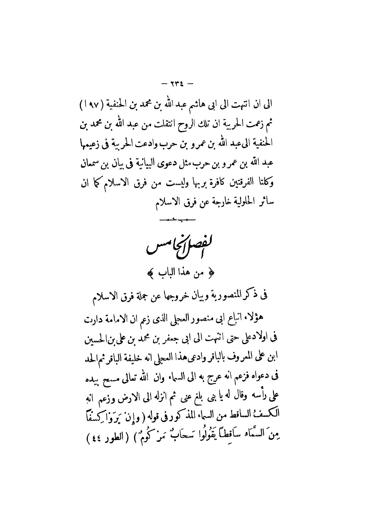 الْفَصْل الْخَامِس من هَذَا الْبَاب فى ذكر المنصورية وَبَيَان خُرُوجهَا عَن جملَة فرق الاسلام