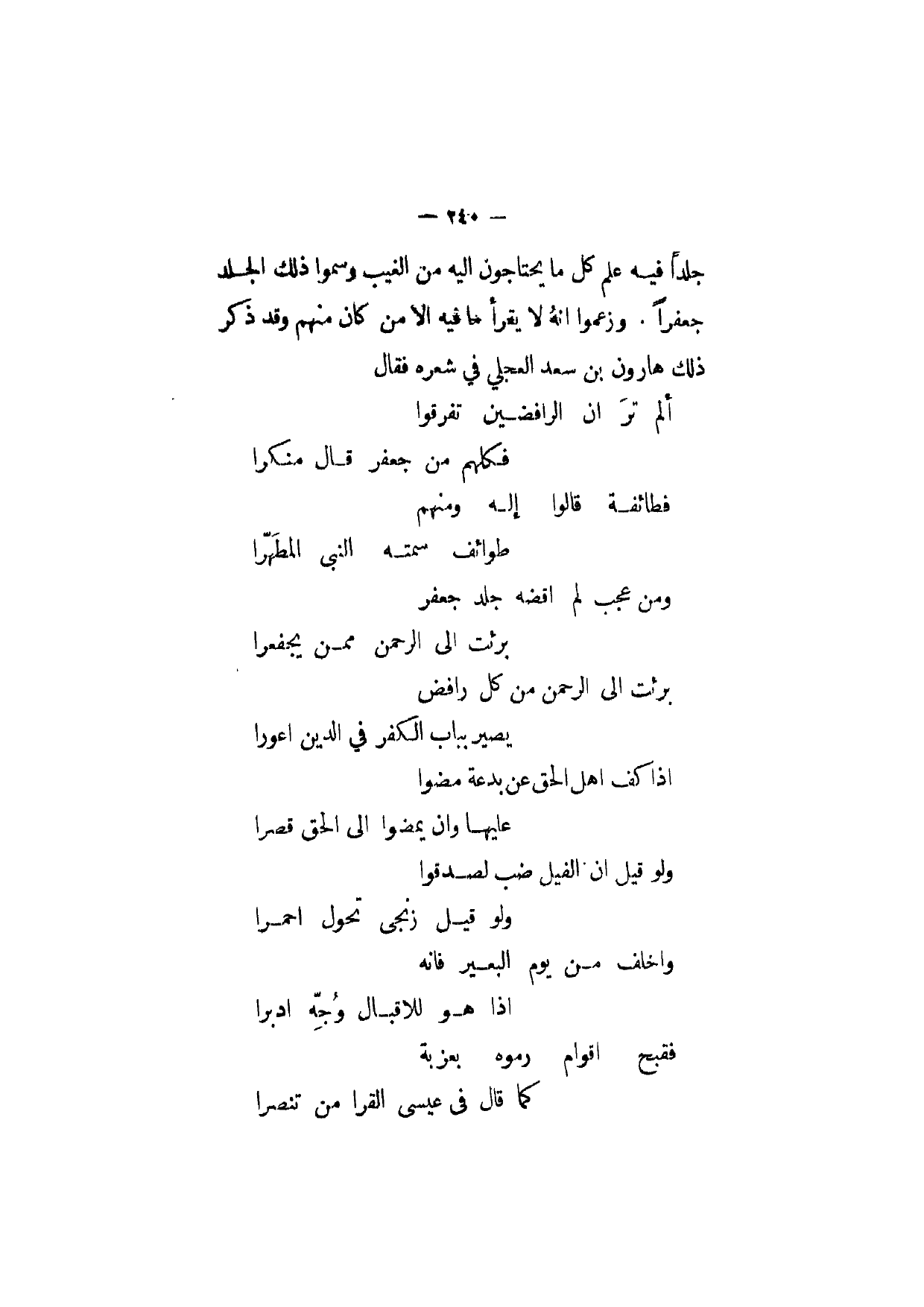جلدا فِيهِ علم كل مَا يَحْتَاجُونَ اليه من الْغَيْب وَسموا ذَلِك الْجلد جعفرا وَزَعَمُوا انه لَا يقْرَأ مَا فِيهِ الا من كَانَ مِنْهُم وَقد ذكر ذَلِك هَارُون بن سعد الْعجلِيّ فِي شعره فَقَالَ ... ألم تَرَ ان الرافضين تفَرقُوا