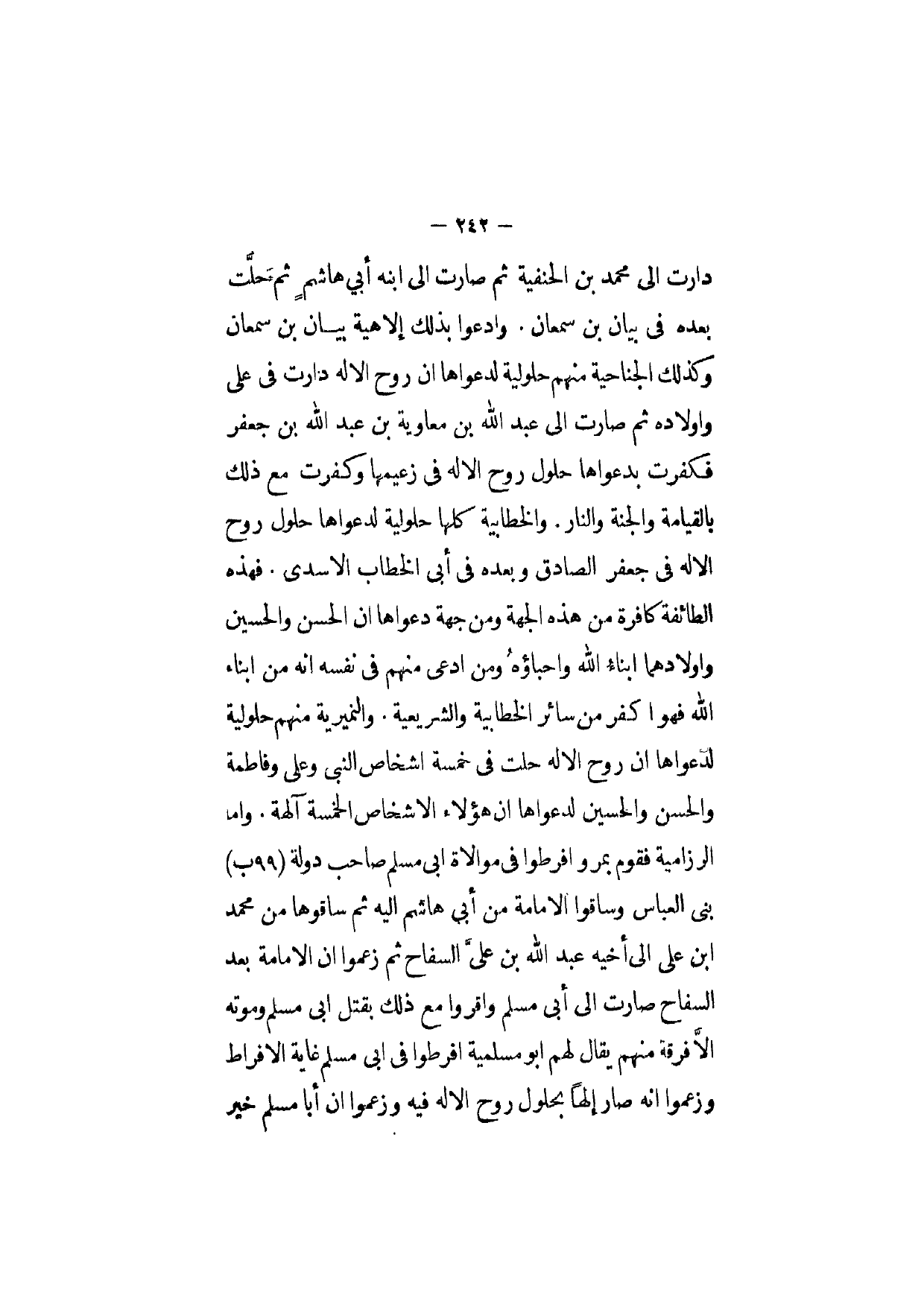 دارت الى مُحَمَّد بن الْحَنَفِيَّة ثمَّ صَارَت الى ابْنه أَبى هَاشم ثمَّ حلت بعده فى بَيَان بن سمْعَان وَادعوا بذلك إلاهية بَيَان بن سمْعَان وَكَذَلِكَ الجناحية مِنْهُم حلولية لدعواها ان روح الاله دارت فى على واولاده ثمَّ صَارَت الى عبد الله بن مُعَاوِيَة بن عبد الله بن جَعْفَر فكفرت بدعواها حُلُول روح الاله فى زعيمها وكفرت مَعَ ذَلِك بالقيامة وَالْجنَّة وَالنَّار والخطابية كلهَا حلولية لدعواها حُلُول روح الاله فى جَعْفَر الصَّادِق وَبعده فى أَبى الْخطاب الاسدى فَهَذِهِ الطَّائِفَة كَافِرَة من هَذِه الْجِهَة وَمن جِهَة دَعْوَاهَا ان الْحسن وَالْحُسَيْن واولادهما ابناء الله واحباؤه وَمن ادّعى مِنْهُم فى نَفسه انه من ابناء الله فَهُوَ اكفر من سَائِر الخطابية والشريعية والنميرية مِنْهُم حلولية لدعواها ان روح الاله حلت فى خمس اشخاص النَّبِي وعَلى وَفَاطِمَة وَالْحسن وَالْحُسَيْن لدعواها ان هَؤُلَاءِ الاشخاص الْخَمْسَة آلِهَة واما الرزامية فقوم بمرو افرطوا فى مُوالَاة ابى مُسلم صَاحب دولة بنى الْعَبَّاس وَسَاقُوا الامامة من أَبى هَاشم اليه ثمَّ ساقوها من مُحَمَّد ابْن على الى أَخِيه عبد الله بن على السفاح ثمَّ زَعَمُوا ان الامامة بعد السفاح صَارَت الى أَبى مُسلم واقروا مَعَ ذَلِك بقتل ابى مُسلم وَمَوته الافرقة مِنْهُم يُقَال لَهُم ابو مسلمية افرطوا فى ابى مُسلم غَايَة الافراط وَزَعَمُوا انه صَار الها بحلول روح الاله فِيهِ وَزَعَمُوا ان ابا مُسلم خير