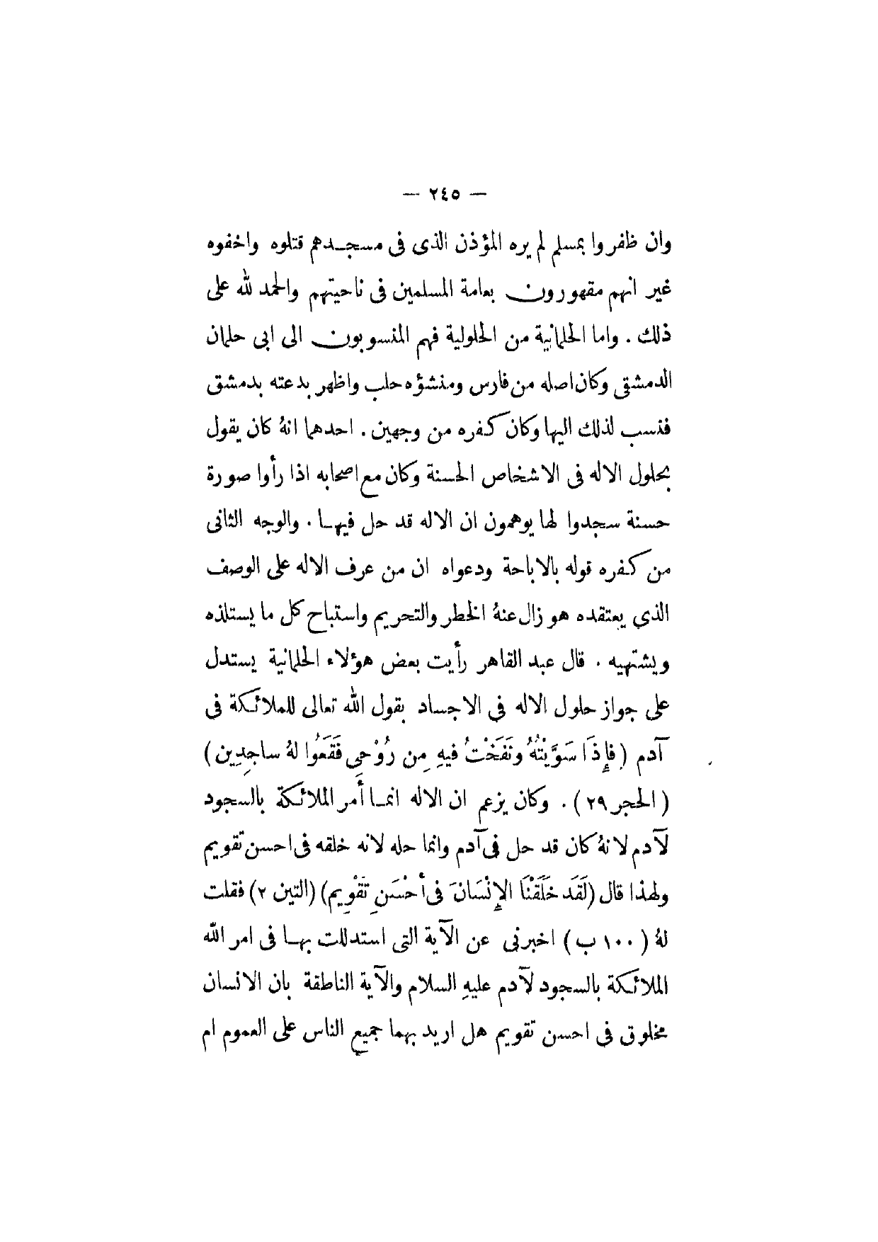 وان ظفروا بِمُسلم لم يره الْمُؤَذّن الذى فى مَسْجِدهمْ قَتَلُوهُ واخفوه غير انهم مقهورون بعامة الْمُسلمين فى ناحيتهم وَالْحَمْد لله على ذَلِك واما الحلمانية من الحلولية فهم المنسوبون الى ابى حلمان الدمشقى وَكَانَ اصله من فَارس ومنشؤه حلب واظهر بدعته بِدِمَشْق فنسب لذَلِك اليها وَكَانَ كفره من وَجْهَيْن احدهما انه كَانَ يَقُول بحلول الاله فى الاشخاص الْحَسَنَة وَكَانَ مَعَ اصحابه اذا رَأَوْا صُورَة حَسَنَة سجدوا لَهَا يوهمون ان الاله قد حل فِيهَا وَالْوَجْه الثانى من كفره قَوْله بالاباحة ودعواه ان من عرف الاله على الْوَصْف الذى يَعْتَقِدهُ هُوَ زَالَ عَنهُ الْخطر وَالتَّحْرِيم واستباح كل مَا يستلذه ويشتهيه قَالَ عبد القاهر رَأَيْت بعض هَؤُلَاءِ الحلمانية يسْتَدلّ على جَوَاز حُلُول الاله فى الاجساد بقول الله تَعَالَى للْمَلَائكَة فى آدم {فَإِذا سويته ونفخت فِيهِ من روحي فقعوا لَهُ ساجدين} وَكَانَ يزْعم ان الاله انما أَمر الْمَلَائِكَة بِالسُّجُود لآدَم لانه كَانَ قد حل فى آدم وانما حلّه لانه خلقه فى احسن تَقْوِيم وَلِهَذَا قَالَ {لقد خلقنَا الْإِنْسَان فِي أحسن تَقْوِيم} فَقلت لَهُ اخبرنى عَن الْآيَة الَّتِى استدللت بهَا فى امْر الله الْمَلَائِكَة بِالسُّجُود لآدَم عَلَيْهِ السَّلَام وَالْآيَة الناطقة بَان الانسان مَخْلُوق فى احسن تَقْوِيم هَل اريد بهما جَمِيع النَّاس على الْعُمُوم ام