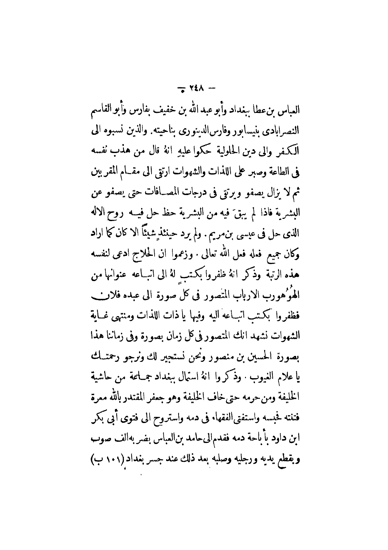 الْعَبَّاس بن عطا بِبَغْدَاد وَأَبُو عبد الله بن خَفِيف بِفَارِس وَأَبُو الْقَاسِم النصرابادى بنيسابور وَفَارِس الدينورى بناحيته وَالَّذين نسبوه الى الْكفْر والى دين الحلولية حكوا عَلَيْهِ انه قَالَ من هذب نَفسه فى الطَّاعَة وصبر على اللَّذَّات والشهوات ارْتقى الى مقَام المقربين ثمَّ لَا يزَال يصفو ويرتقى فى دَرَجَات المصافات حَتَّى يصفو عَن البشرية فاذا لم يبْق فِيهِ من البشرية حَظّ حل فِيهِ روح الاله الذى حل فى عِيسَى بن مَرْيَم وَلم يرد حِينَئِذٍ شَيْئا الا كَانَ كَمَا اراد وَكَانَ جَمِيع فعله فعل الله تَعَالَى وَزَعَمُوا ان الحلاج ادّعى لنَفسِهِ هَذِه الرُّتْبَة وَذكر انه ظفروا بكتب لَهُ الى اتِّبَاع عنوانها من الهو هورب الارباب المتصور فى كل صُورَة الى عَبده فلَان فظفروا بكتب اتِّبَاعه اليه وفيهَا يَا ذَات اللَّذَّات ومنتهى غَايَة الشَّهَوَات تشهد انك المتصور فى كل زمَان بِصُورَة وفى زَمَاننَا هَذَا بِصُورَة الْحُسَيْن بن مَنْصُور وَنحن نستجير لَك وَنَرْجُو رحمتك يَا علام الغيوب وَذكروا انه استمال بِبَغْدَاد جمَاعَة من حَاشِيَة الْخَلِيفَة وَمن حرمه حَتَّى خَافَ الْخَلِيفَة وَهُوَ جَعْفَر المقتدر بِاللَّه معرة فتنته فحبسه واستفتى الْفُقَهَاء فى دَمه واستروح الى فَتْوَى أَبى بكر ابْن دَاوُد بآباحة دَمه فَقدم الى حَامِد بن الْعَبَّاس بضربه الف صَوت وبقطع يَدَيْهِ وَرجلَيْهِ وصلبه بعد ذَلِك عِنْد جسر بَغْدَاد