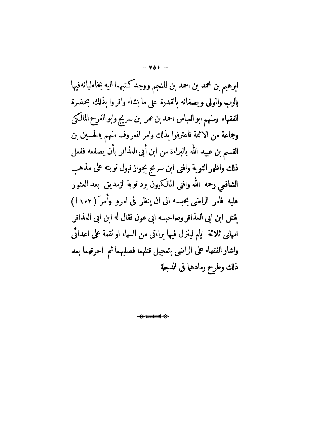 ابراهيم بن مُحَمَّد بن احْمَد بن المنجم وَوجد كتبهما اليه يخاطبانه فِيهَا بالرب وَالْمولى ويصفانه بِالْقُدْرَةِ على مَا يَشَاء واقروا بذلك بِحَضْرَة الْفُقَهَاء وَمِنْهُم ابو الْعَبَّاس احْمَد بن عمر بن سُرَيج وابو الْفَرح المالكى وَجَمَاعَة من الائمة فَاعْتَرفُوا بذلك وامر الْمَعْرُوف مِنْهُم بالحسين بن الْقسم بن عبيد الله بِالْبَرَاءَةِ من ابْن أَبى العذاقر بِأَن يصفعه فَفعل ذَلِك واظهر التَّوْبَة وافتى ابْن سُرَيج بِجَوَاز قبُول تَوْبَته على مَذْهَب الشَّافِعِي رَحمَه الله وافتى المالكيون برد تَوْبَة الزنديق بعد العثور عَلَيْهِ فامر الراضى بحبسه الى ان ينظر فى امْرَهْ وَأمر بقتل ابْن ابى العذاقر وَصَاحبه ابى عون فَقَالَ لَهُ ابْن ابي العذاقر امهلنى ثَلَاثَة ايام لينزل فِيهَا براءتى من السَّمَاء اَوْ نقمة على اعدائى وَأَشَارَ الْفُقَهَاء على الراضى بتعجيل قَتلهمَا فصلبهما ثمَّ احرقهما بعد ذَلِك وَطرح رمادهما فى الدجلة