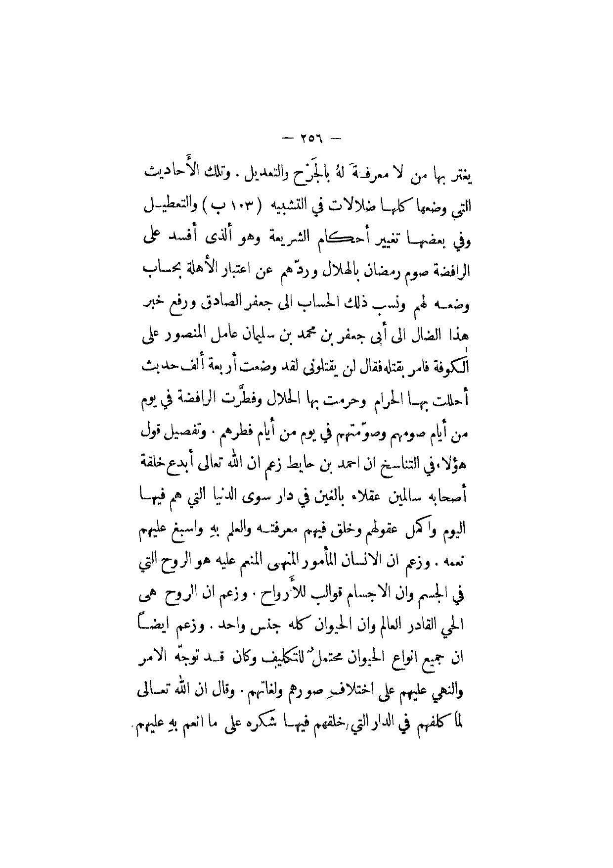 يغتر بهَا من لَا معرفَة لَهُ بِالْجرْحِ وَالتَّعْدِيل وَتلك الاحاديث الَّتِى وَضعهَا كلهَا ضلالات فِي التَّشْبِيه والتعطيل وَفِي بَعْضهَا تَغْيِير أَحْكَام الشَّرِيعَة وَهُوَ الذى أفسد على الرافضة صَوْم رَمَضَان بالهلال وردهم عَن اعْتِبَار الاهلة بِحِسَاب وَضعه لَهُم وَنسب ذَلِك الْحساب الى جَعْفَر الصَّادِق وَرفع خبر هَذَا الضال الى أَبى جَعْفَر بن مُحَمَّد بن سُلَيْمَان عَامل الْمَنْصُور على الْكُوفَة فامر بقتْله فَقَالَ لن يقتلونى لقد وضعت أَرْبَعَة ألف حَدِيث أحللت بهَا الْحَرَام وَحرمت بهَا الْحَلَال وفطرت الرافضة فِي يَوْم من أَيَّام صومهم وصومتهم فِي يَوْم من أَيَّام فطرهم وتفصيل قَول هَؤُلَاءِ فِي التناسخ ان احْمَد بن حايط زعم ان الله تَعَالَى ابدع خلقَة أَصْحَابه سَالِمين عقلاء بالغين فِي دَار سوى الدُّنْيَا الَّتِي هم فِيهَا الْيَوْم واكمل عُقُولهمْ وَخلق فيهم مَعْرفَته وَالْعلم بِهِ واسبغ عَلَيْهِم نعمه وَزعم ان الانسان الْمَأْمُور المنهى الْمُنعم عَلَيْهِ هُوَ الرّوح الَّتِي فِي الْجِسْم وان الاجسام قوالب للأرواح وَزعم ان الرّوح هِيَ الْحَيّ الْقَادِر الْعَالم وان الْحَيَوَان كُله جنس وَاحِد وَزعم ايضا ان جَمِيع انواع الْحَيَوَان مُحْتَمل للتكليف وَكَانَ قد توجه الامر وَالنَّهْي عَلَيْهِم على اخْتِلَاف صورهم ولغاتهم وَقَالَ ان الله تَعَالَى لما كلفهم فِي الدَّار الَّتِي خلقهمْ فِيهَا شكره على مَا انْعمْ بِهِ عَلَيْهِم
