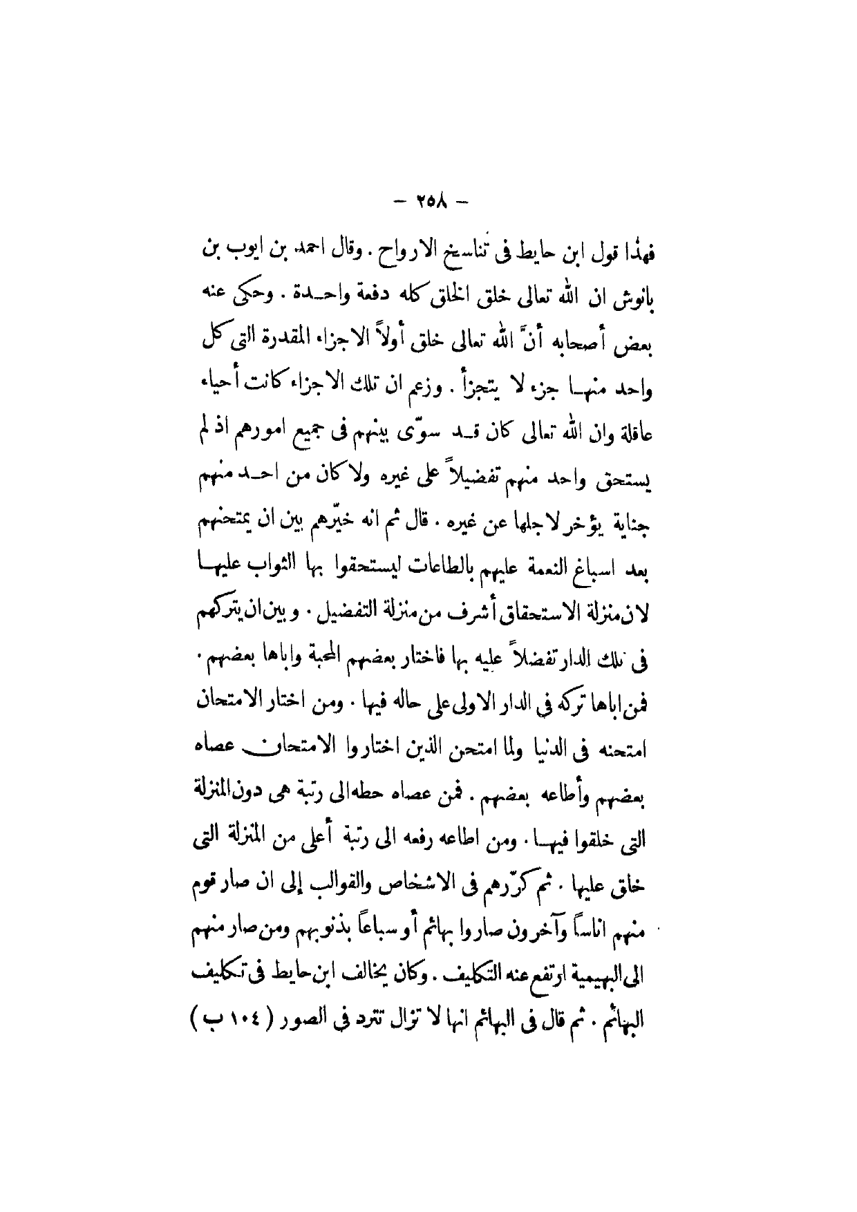 فَهَذَا قَول ابْن حايط فى تناسخ الارواح وَقَالَ احْمَد بن ايوب بن بانوش ان الله تَعَالَى خلق الْخلق كُله دَفعه وَاحِدَة وَحكى عَنهُ بعض اصحابه أَن الله تَعَالَى خلق أَولا الاجزاء الْمقدرَة الَّتِي كل وَاحِد مِنْهَا جُزْء لَا يتَجَزَّأ وَزعم ان تِلْكَ الاجزاء كَانَت أَحيَاء عَاقِلَة وان الله تَعَالَى كَانَ قد سوى بَينهم فى جَمِيع امورهم اذ لم يسْتَحق وَاحِد مِنْهُم تَفْضِيلًا على غَيره وَلَا كَانَ من اُحْدُ مِنْهُم جِنَايَة يُؤَخر لاجلها عَن غَيره قَالَ ثمَّ انه خَيرهمْ بَين ان يمتحنهم بعد اسباغ النِّعْمَة عَلَيْهِم بالطاعات ليستحقوا بهَا الثَّوَاب عَلَيْهَا لَان منزلَة الِاسْتِحْقَاق أشرف من منزلَة التَّفْضِيل وَبَين ان يتركهم فِي تِلْكَ الدَّار تفضلا عَلَيْهِ بهَا فَاخْتَارَ بَعضهم الْمحبَّة واباها بَعضهم فَمن اباها تَركه فى الدَّار الاولى على حَاله فِيهَا وَمن اخْتَار الامتحان امتحنه فى الدُّنْيَا وَلما امتحن الَّذين اخْتَارُوا الامتحان عَصَاهُ بَعضهم وأطاعه بَعضهم فَمن عَصَاهُ حطه الى رُتْبَة هى دون الْمنزلَة الَّتِى خلقُوا فِيهَا وَمن اطاعه رَفعه الى رُتْبَة اعلى من الْمنزلَة الَّتِى خلق عَلَيْهَا ثمَّ كررهم فى الاشخاص والقوالب إِلَى ان صَار قوم مِنْهُم اناسا وَآخَرُونَ صَارُوا بهائم أَو سباعا بِذُنُوبِهِمْ وَمن صَار مِنْهُم الى البهيمية ارْتَفع عَنهُ التَّكْلِيف وَكَانَ يُخَالف ابْن حايط فى تَكْلِيف الْبَهَائِم ثمَّ قَالَ فى الْبَهَائِم انها لَا تزَال تَتَرَدَّد فى الصُّور