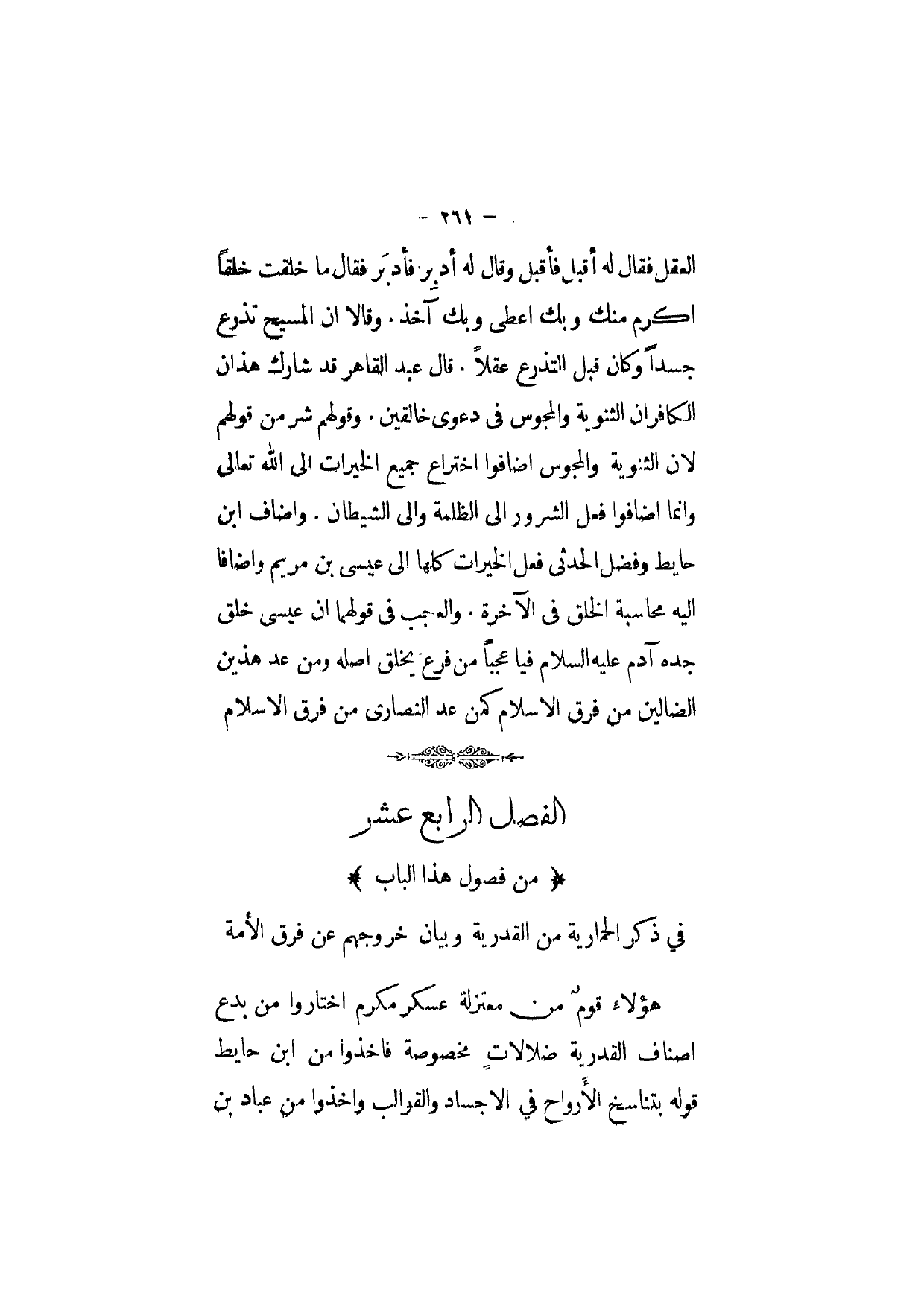 الْعقل فَقَالَ لَهُ أقبل فَأقبل وَقَالَ لَهُ أدبر فَأَدْبَرَ فَقَالَ مَا خلقت خلقا اكرم مِنْك وَبِك اعطى وَبِك آخذ وَقَالا ان الْمَسِيح تذرع جسدا وَكَانَ قبل التذرع عقلا قَالَ عبد القاهر قد شَارك هَذَانِ الكافران الثنوية وَالْمَجُوس فى دَعْوَى خالقين وَقَوْلهمْ شَرّ من قَوْلهم لَان الثنوية وَالْمَجُوس اضافوا اختراع جَمِيع الْخيرَات الى الله تَعَالَى وانما اضافوا فعل الشرور الى الظلمَة والى الشَّيْطَان واضاف ابْن حايط وَفضل الحدثى فعل الْخيرَات كلهَا الى عِيسَى بن مَرْيَم واضافا اليه محاسبة الْخلق فى الْآخِرَة وَالْعجب فى قَوْلهمَا ان عِيسَى خلق جده آدم عَلَيْهِ السَّلَام فيا عجبا من فرع يخلق اصله وَمن عد هذَيْن الضَّالّين من فرق الاسلام كمن عد النَّصَارَى من فرق الاسلام