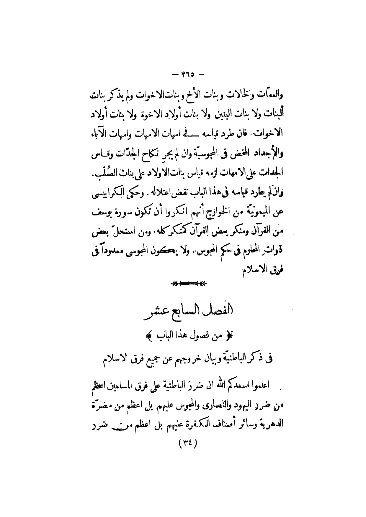 اعلموا اسعدكم الله ضَرَر الباطنية على فرق الْمُسلمين اعظم من ضَرَر الْيَهُود وَالنَّصَارَى والمجوز عَلَيْهِم بل اعظم من مضرَّة الدهرية وَسَائِر أَصْنَاف الْكَفَرَة عَلَيْهِم بل اعظم من ضَرَر