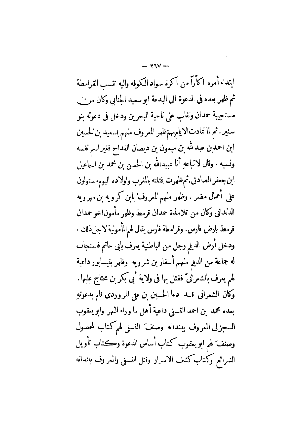 ابْتِدَاء أمره اكارا من اكرة سَواد الْكُوفَة واليه تنْسب القرامطة ثمَّ ظهر بعده فى الدعْوَة الى الْبِدْعَة ابو سعيد الجنابى وَكَانَ من مستجيبة حمدَان وتغلب على نَاحيَة الْبَحْرين وَدخل فى دَعوته بَنو سنير ثمَّ لما تمادت الايام بهم ظهر الْمَعْرُوف مِنْهُم بِسَعِيد بن الْحُسَيْن ابْن احْمَد بن عبد الله بن مَيْمُون بن ديصان القداح فَغير اسْم نَفسه وَنسبه وَقَالَ لاتباعه أَنا عبيد الله بن الْحسن بن مُحَمَّد بن اسماعيل ابْن جَعْفَر الصَّادِق ثمَّ ظَهرت فتنته بالمغرب واولاده الْيَوْم مستولون على أَعمال مُضر وَظهر مِنْهُم الْمَعْرُوف بِابْن كرويه بن مهرويه الدندانى وَكَانَ من تلامذة حمدَان قرمط وَظهر مَأْمُون اخو حمدَان قرمط بارض فَارس وقرامطة فَارس يُقَال لَهُم المأمونية لاجل ذَلِك وَدخل أَرض الديلم رجل من الباطنية يعرف بابى حَاتِم فَاسْتَجَاب لَهُ جمَاعَة من الديلم مِنْهُم أسفار بن شرويه وَظهر بنيسابور دَاعِيَة لَهُم يعرف بالشعرانى فَقتل بهَا فى ولَايَة أَبى بكر بن مُحْتَاج عَلَيْهَا وَكَانَ الشعرانى قد دَعَا الْحُسَيْن بن على المروردى قَامَ بدعوته بعده مُحَمَّد بن احْمَد النسفى دَاعِيَة أهل مَا وَرَاء النَّهر وابو يَعْقُوب السجزلى الْمَعْرُوف ببندانه وصنف النسفى لَهُم كتاب الْمَحْصُول وصنف لَهُم ابو يَعْقُوب كتاب اساس الدعْوَة وَكتاب تَأْوِيل الشَّرَائِع وَكتاب كشف الاسرار وَقتل النسفى وَالْمَعْرُوف ببندانه