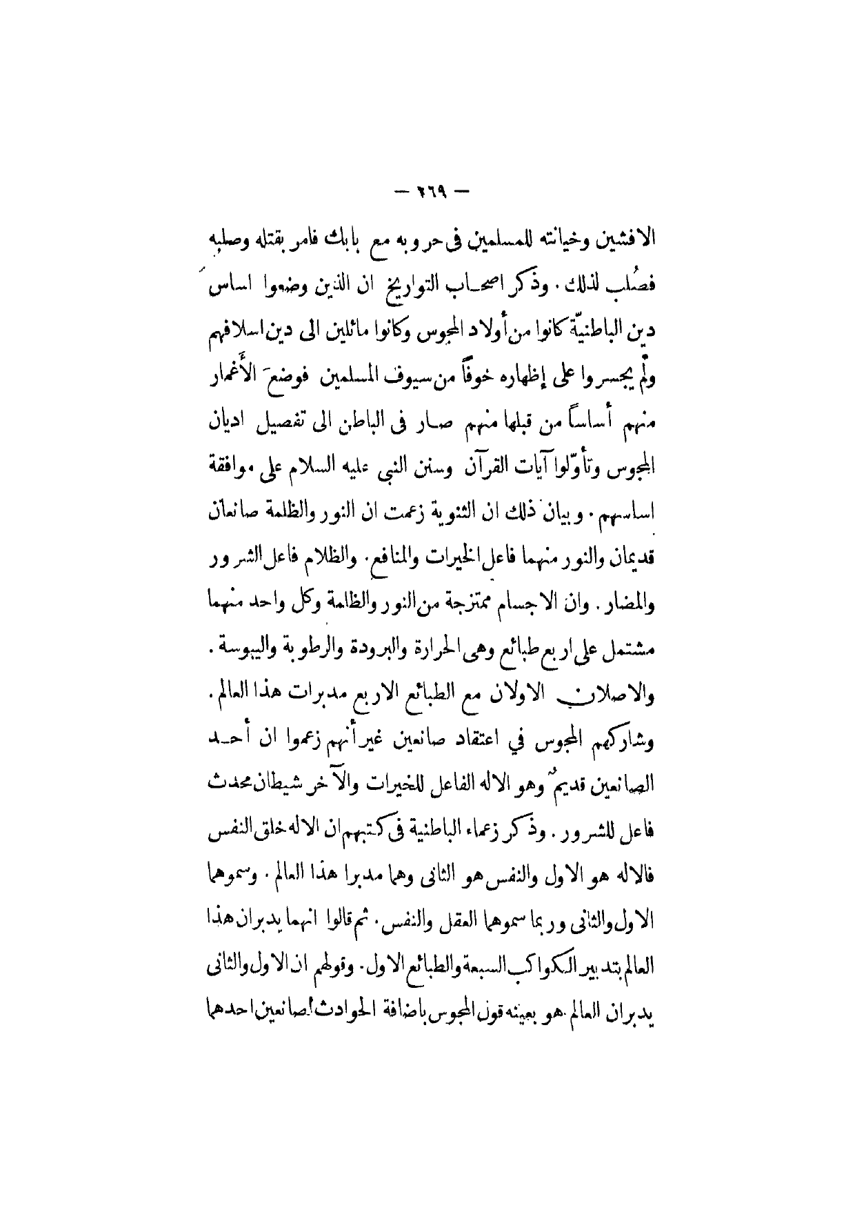 الافشين وخيانته للْمُسلمين فى حروبه مَعَ بابك فامر بقتْله وصلبه فصلب لذَلِك وَذكر اصحاب التواريخ ان الَّذين وضعُوا اساس دين الباطنية كَانُوا من أَوْلَاد الْمَجُوس وَكَانُوا مائلين الى دين اسلافهم وَلم يجسروا على إِظْهَاره خوفًا من سيوف الْمُسلمين فَوضع الأغمال مِنْهُم اساسا من قبلهَا مِنْهُم صَار فى الْبَاطِن الى تَفْصِيل اديان الْمَجُوس وتأولوا آيَات الْقُرْآن وَسنَن النبى عَلَيْهِ السَّلَام على مُوَافقَة اساسهم وَبَيَان ذَلِك ان الثنوية زعمت ان النُّور والظلمة صانعان قديمان والنور مِنْهُمَا فَاعل الْخيرَات وَالْمَنَافِع والظلام فَاعل الشرور والمضار وان الاجسام ممتزجة من النُّور والظلمة وكل وَاحِد مِنْهُمَا مُشْتَمل على ارْبَعْ طبائع وهى الْحَرَارَة والبرودة والرطوبة واليبوسة والاصلان الاولان مَعَ الطبائع الاربع مدبرات هَذَا الْعَالم وشاركهم الْمَجُوس فِي اعْتِقَاد صانعين غير أَنهم زَعَمُوا ان أحد الصانعين قديم وَهُوَ الاله الْفَاعِل لِلْخَيْرَاتِ وَالْآخر شَيْطَان مُحدث فَاعل للشرور وَذكر زعماء الباطنية فى كتبهمْ ان الاله خلق النَّفس فالاله هُوَ الاول وَالنَّفس هُوَ الثانى وهما مُدبرا هَذَا الْعَالم وسموهما الاول والثانى وَرُبمَا سموهما الْعقل وَالنَّفس ثمَّ قَالُوا انهما يدبران هَذَا الْعَالم بتدبير الْكَوَاكِب السَّبْعَة والطبائع الاول وَقَوْلهمْ ان الاول والثانى يدبران الْعَالم هُوَ بِعَيْنِه قَول الْمَجُوس باضافة الْحَوَادِث صانعين احدهما